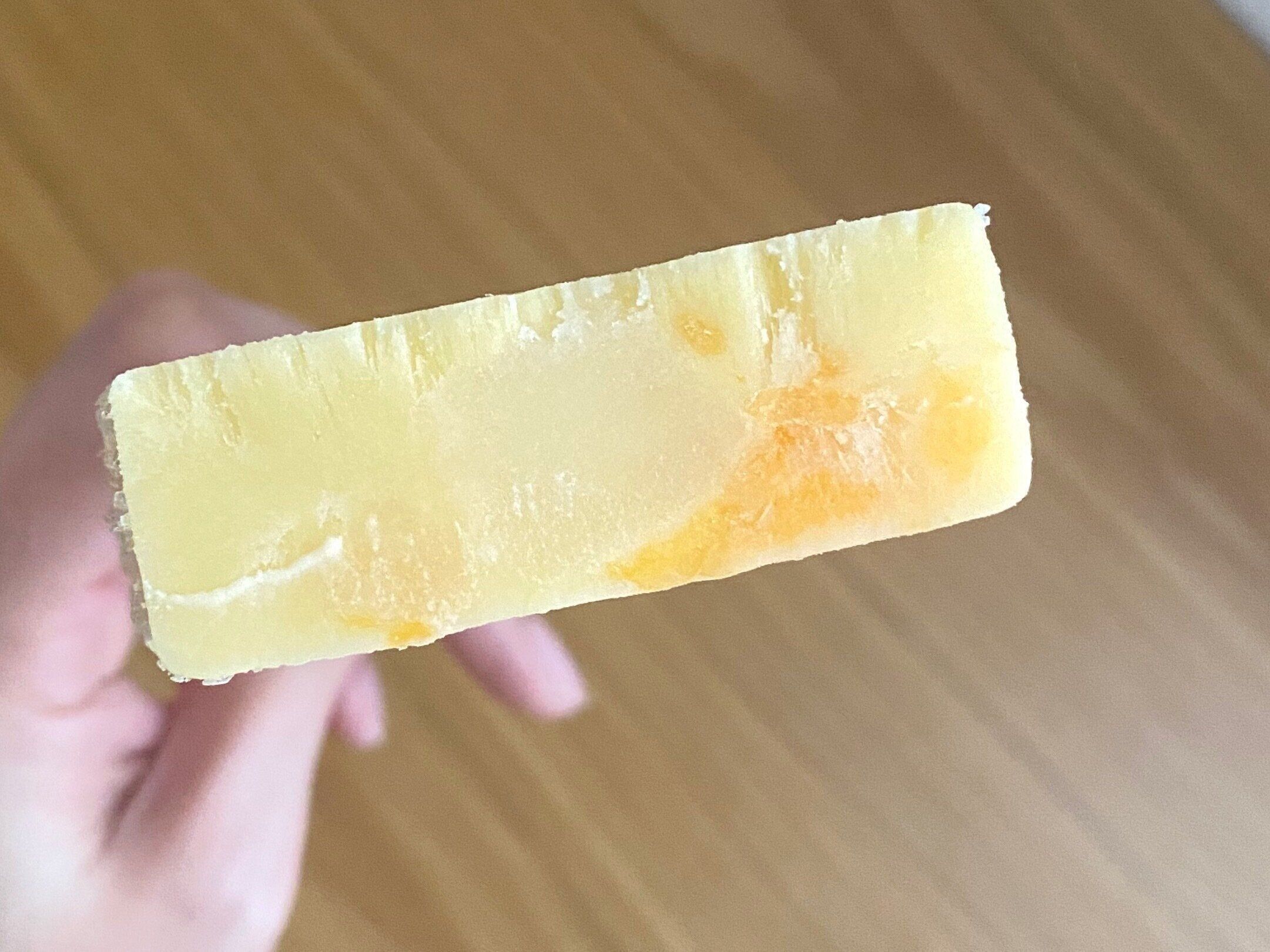 たっぷりと挟まれたアイスには、大きめにカットされたオレンジピールとキャラメルソースが入っています。オレンジピールの爽やかさと苦みがミルクアイスと絶妙にマッチ。キャラメルソースはほんのり感じる程度ですが、トロ~っとした食感がスイーツ感をアップしてくれます。