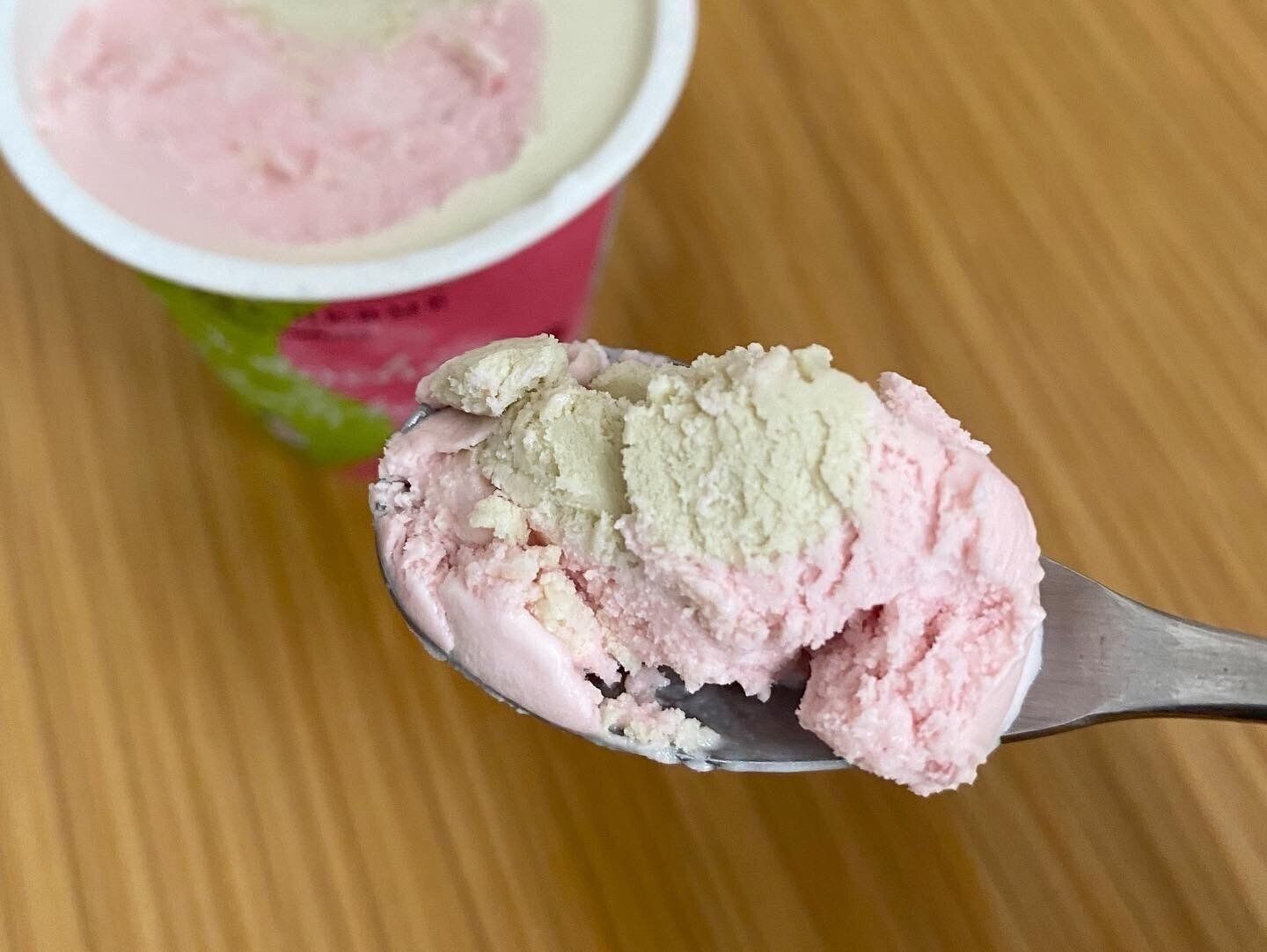 しっかりと果実味のある甘酸っぱいラズベリーアイスと、濃厚でほんのり香ばしさのあるピスタチオアイスが混ざり合うと高級感のある味わいになります。