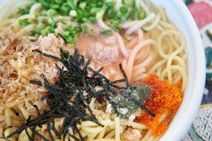 異なる食感を楽しめる2種のたらこをメインに、とびこ、ねぎ、のり、かつおぶし、大葉ペーストがトッピングされています。レンジで温めると、かつおぶしの旨味も足された香りよい優しい味わいの出汁が登場。たらこやとびこのぷちぷちシャキシャキとした豊かな食感と薬味が合わさり絶品です。パスタも、ぷりぷりもちもちで、いつもの麺とは違う感じがしました。残ったお出汁までおいしくいただけます。