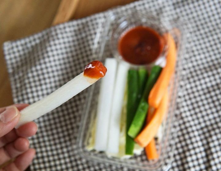 野菜スティックとキャベツを「赤から」監修のピリ辛味噌だれにつけていただきます。筆者が購入した商品には、大根が4本、にんじんときゅうりが3本ずつ入っていました。野菜に絡みやすくするためなのか、味噌だれは粘り気があるタイプ。野菜を食べ終わっても少し味噌が残ったので、家にあるキャベツを追加して食べました。家族からも、また買ってきてと大好評だった一品です。