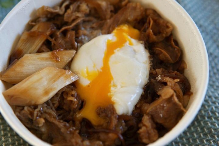 上に乗せられた温泉卵を箸で割り、具材に絡めて食べると更にとろっと美味しい。牛丼とはまた違う、濃いタレに旨味が凝縮された味わいは、贅沢気分に浸れます。