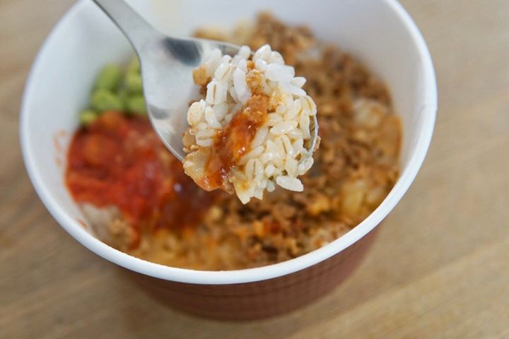 トマトソースや枝豆も入っていて具だくさんなのが嬉しいです。ぷちぷち食感のもち麦入りごはんを使用。枝豆やもち麦が入ることにより食感も豊かになっています。