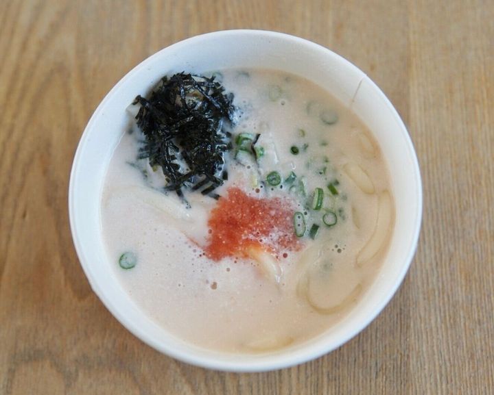 レンジで温めると出現する、ミルク感のある魚介のうまみが溶け込んだクリームスープ。明太子、そしてバターのコクがあわさり、サラッとしているけれどしっかり旨味も感じられるスープパスタです。プリプリな海老の存在感とネギと海苔のアクセントも楽しいです。
