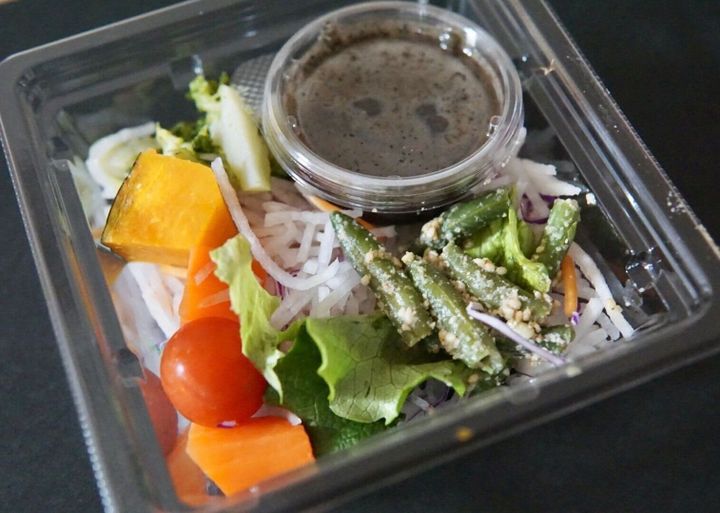 麺も野菜も肉もすべて入っているのが嬉しいです。野菜がシャキシャキで新鮮、麺も固まることなくつるつると、胡麻ポン酢ドレッシングの味もしっかりしていて最後まで美味しくいただけます。この時期にありがちな、急に気温があがってさっぱり系の食事がしたいときにもおススメです。