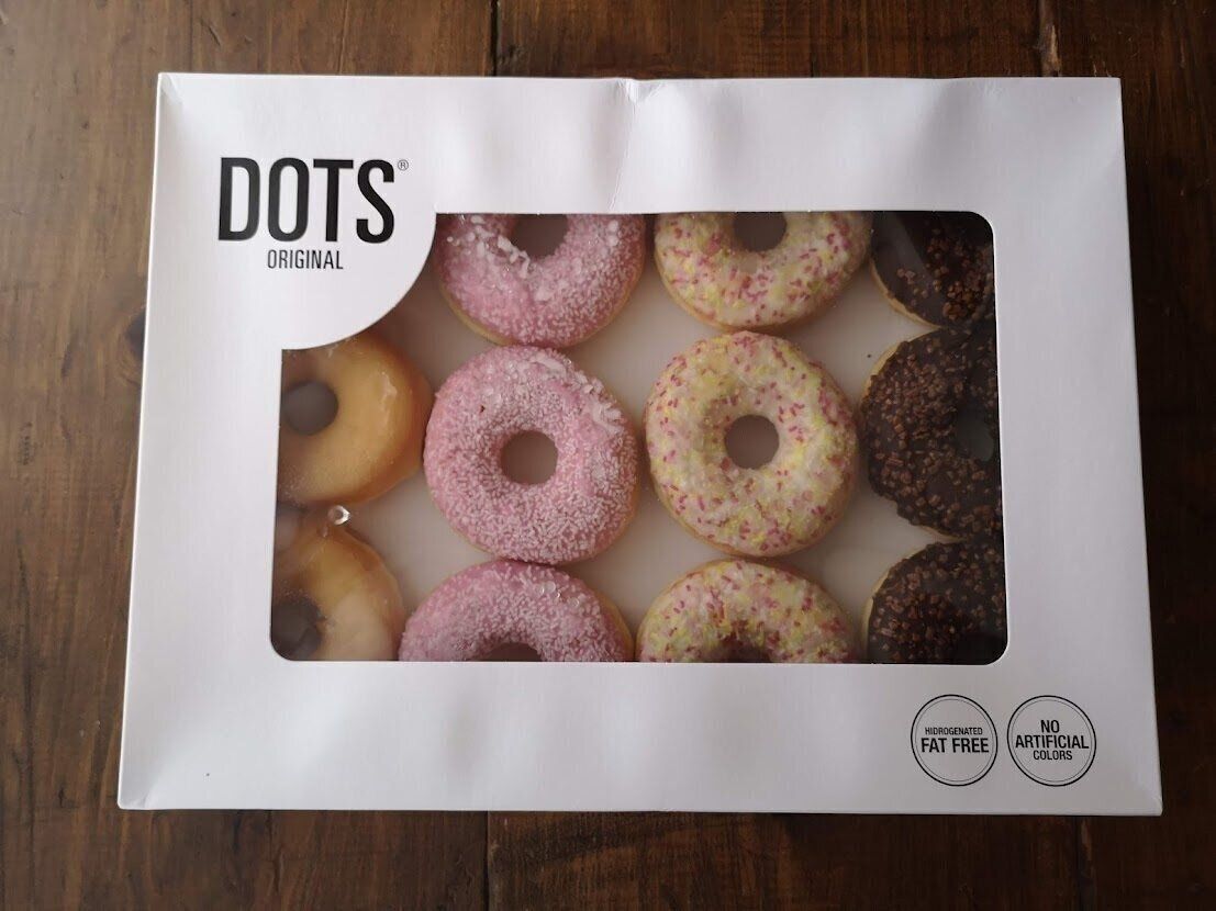 こちらのチョコ風コーティングの種類は、同じメーカーのバケツのような容器に入った丸いドーナツ「ポップドッツ」と同じタイプです。