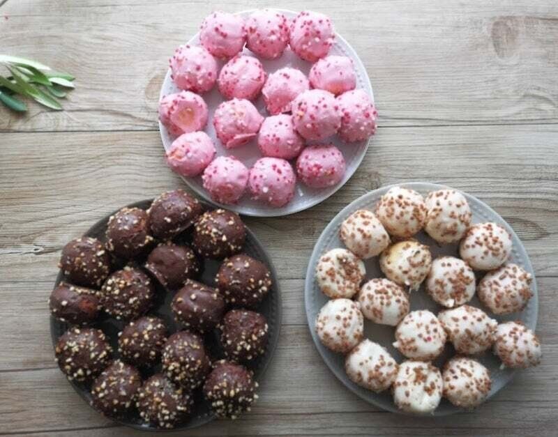 各16個づつで、ピンクは甘いイチゴチョコレートに、カリカリ甘いキャンディークランチ。