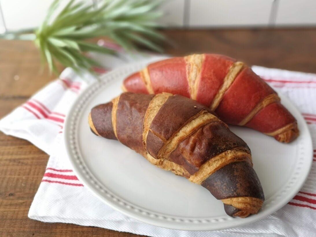 赤と黒、2色のクロワッサンが4つずつ入った商品で、赤いクロワッサンはラズベリー、黒いクロワッサンはココアです。
