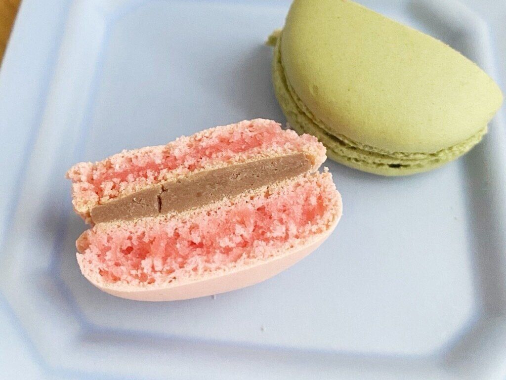 サクサクッと軽い食感の後にマカロン生地がスーッと溶けていき、口どけなめらかなクリームと共にあっという間に口の中から消えていくおもしろい食感。