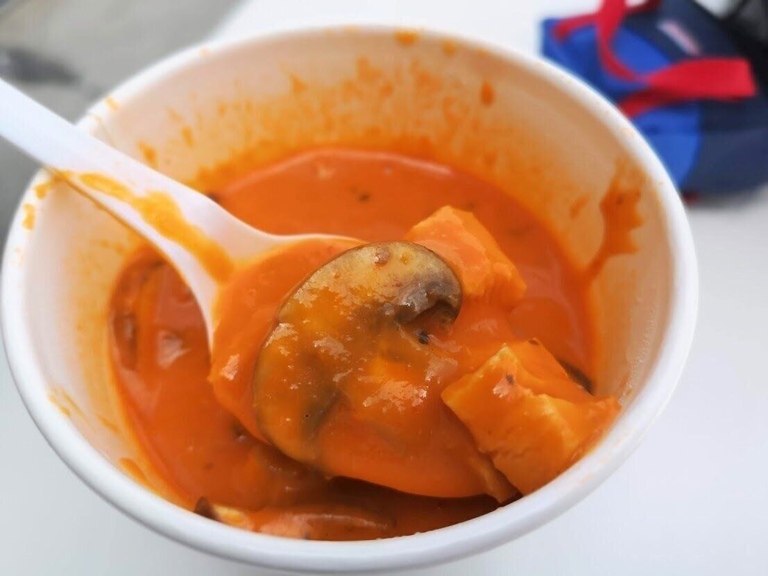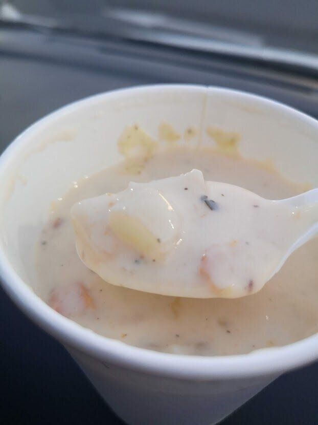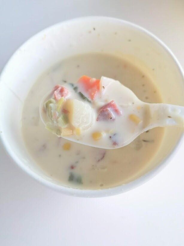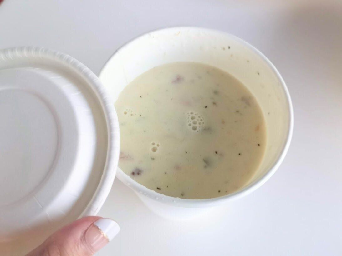 現在販売中のスープはコストコフードコートでもおなじみの「クラムチャウダー」。たっぷりミルキーで魚介のうまみたっぷりなスープに、具もたっぷり。クラッカーが付属でついてくるのも楽しい一品。