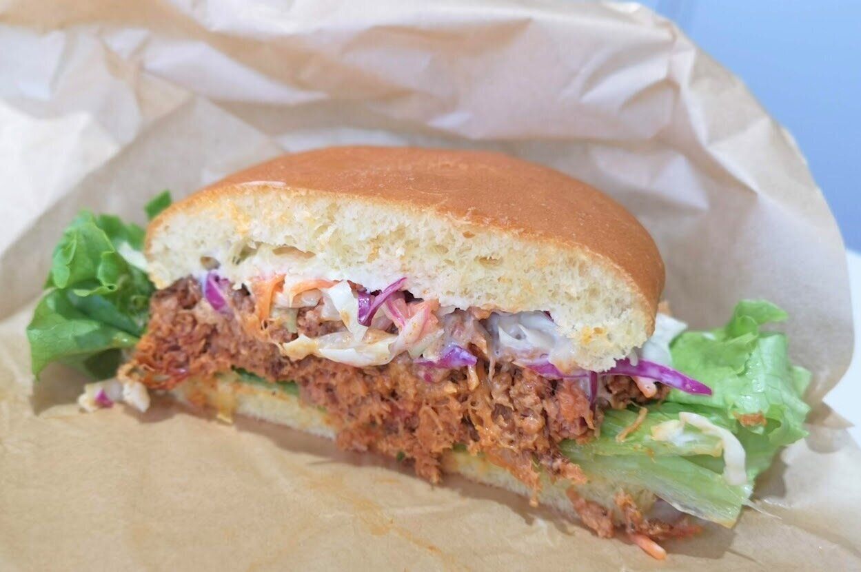 間には、レタスが敷かれプルドポークがどっさりとはさまれています。その上にはコールスローのような野菜がマヨネーズ風のドレッシングにからめられてのせられています。