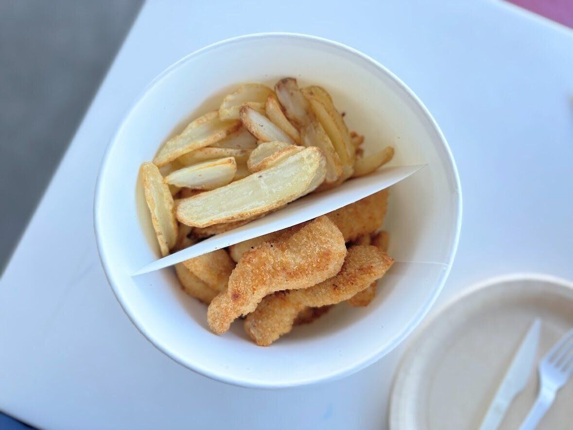 オーブン焼きのウェッジポテトと、サクサク衣のついたチキンスティックは、香ばしくってとまりません!お好みで、フードコートのトッピングでトマトケチャップをお皿にとって、つけながら食べてもおいしいですよ。