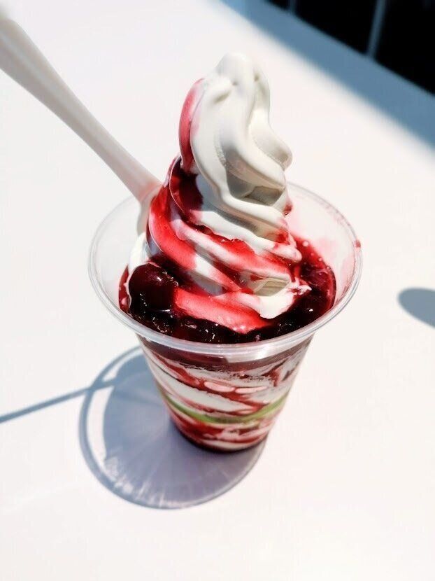 白いソフトクリームと、真っ赤なソースのコントラストが美しいですね~!そこに、ゴロンゴロンっとあふれるブラックチェリー!見るからに心躍ります。