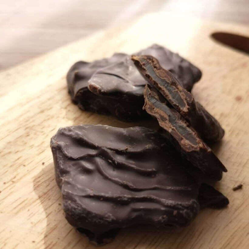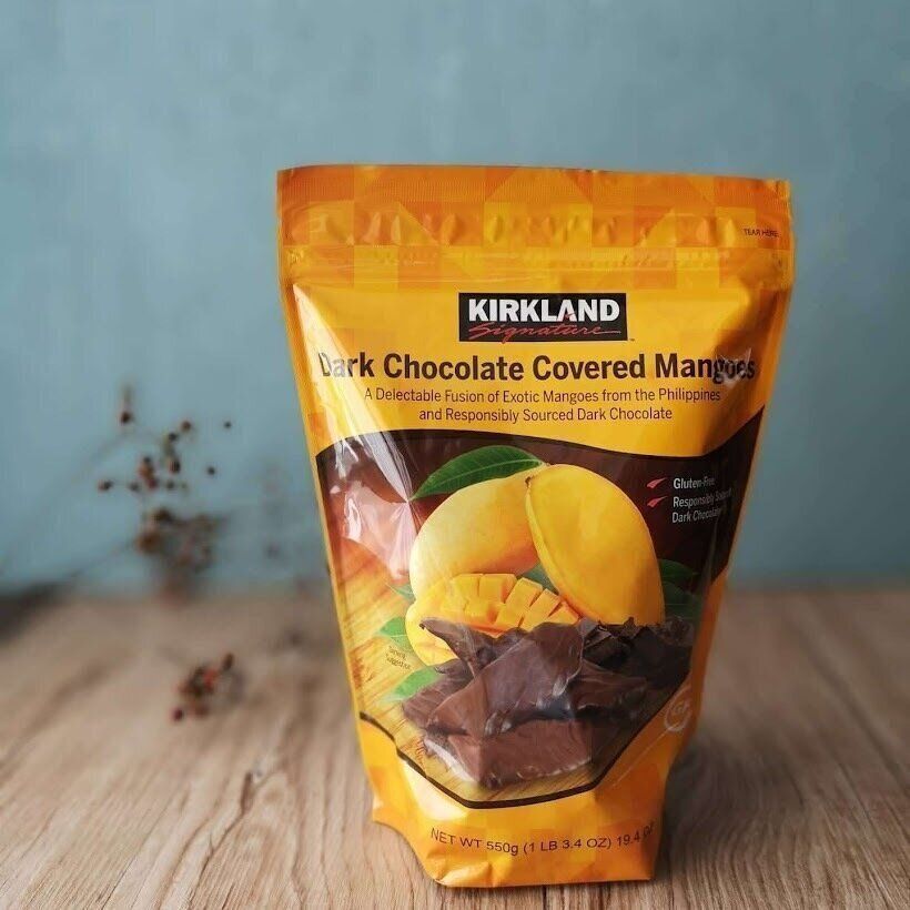 ドライフルーツのマンゴーをダークチョコレートでコーティングした商品。