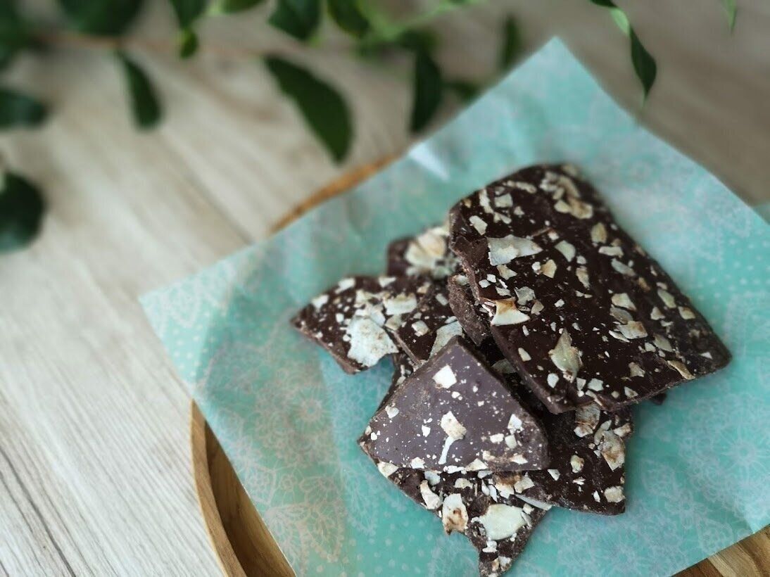 5mmほどに伸ばされたダークチョコレートに薄く削られたナッツがトッピングされた商品で、波型の瓦型の割チョコのような商品。