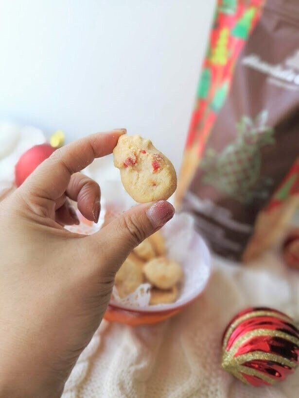 1個あたりは全長7cmほどの大きさで、ピンク色はグアバ味、華やかでトロピカルな香りが感じられるクッキーです。
