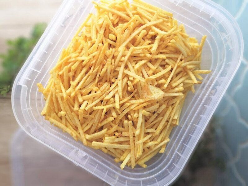 こちらはなんと、26cm×21cm×19cmの四角いバケツに、1kgのスティックポテトがドサッと入った商品!