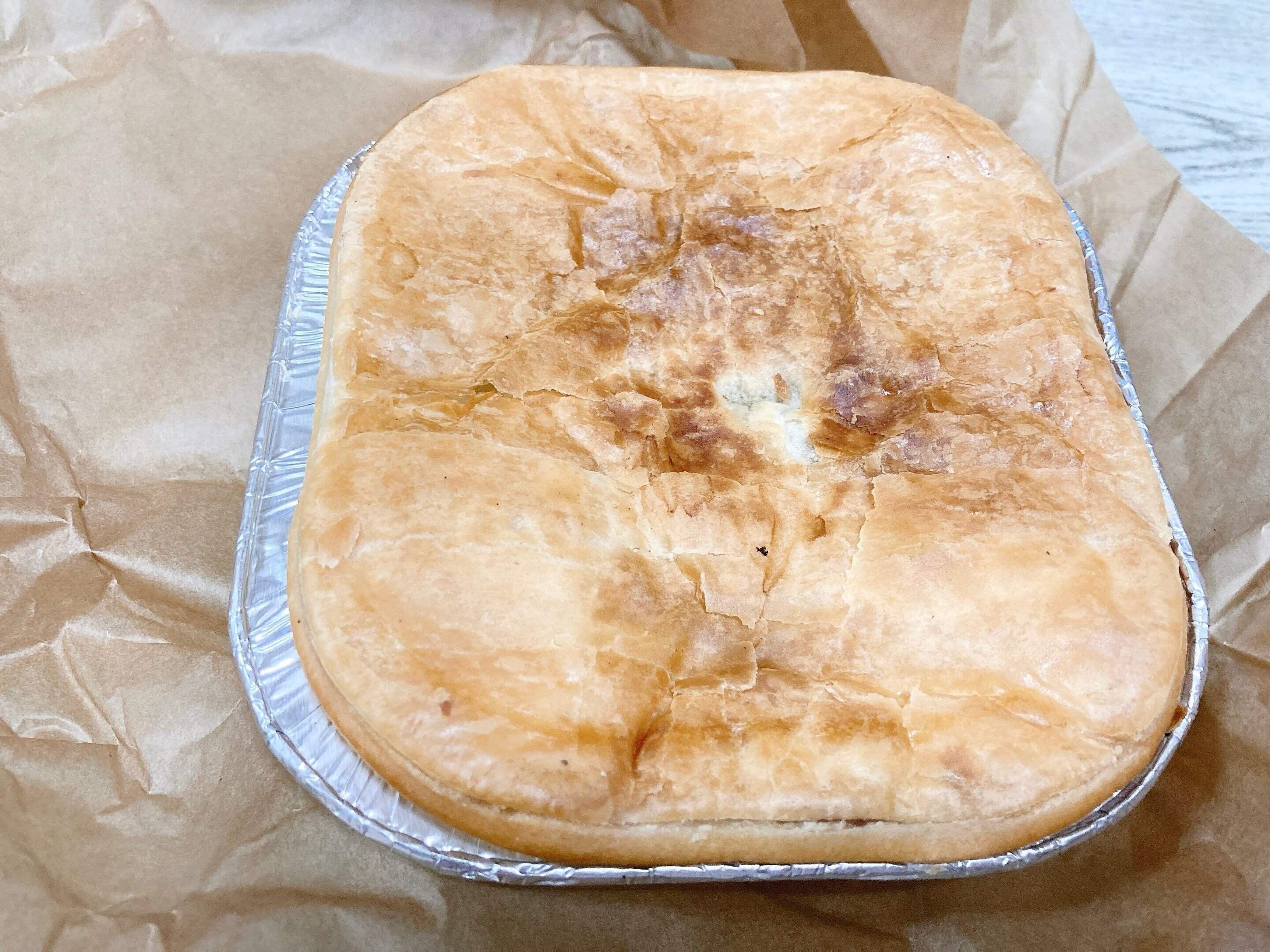 開けてみると、真四角でこんがり焼かれたパイが登場。