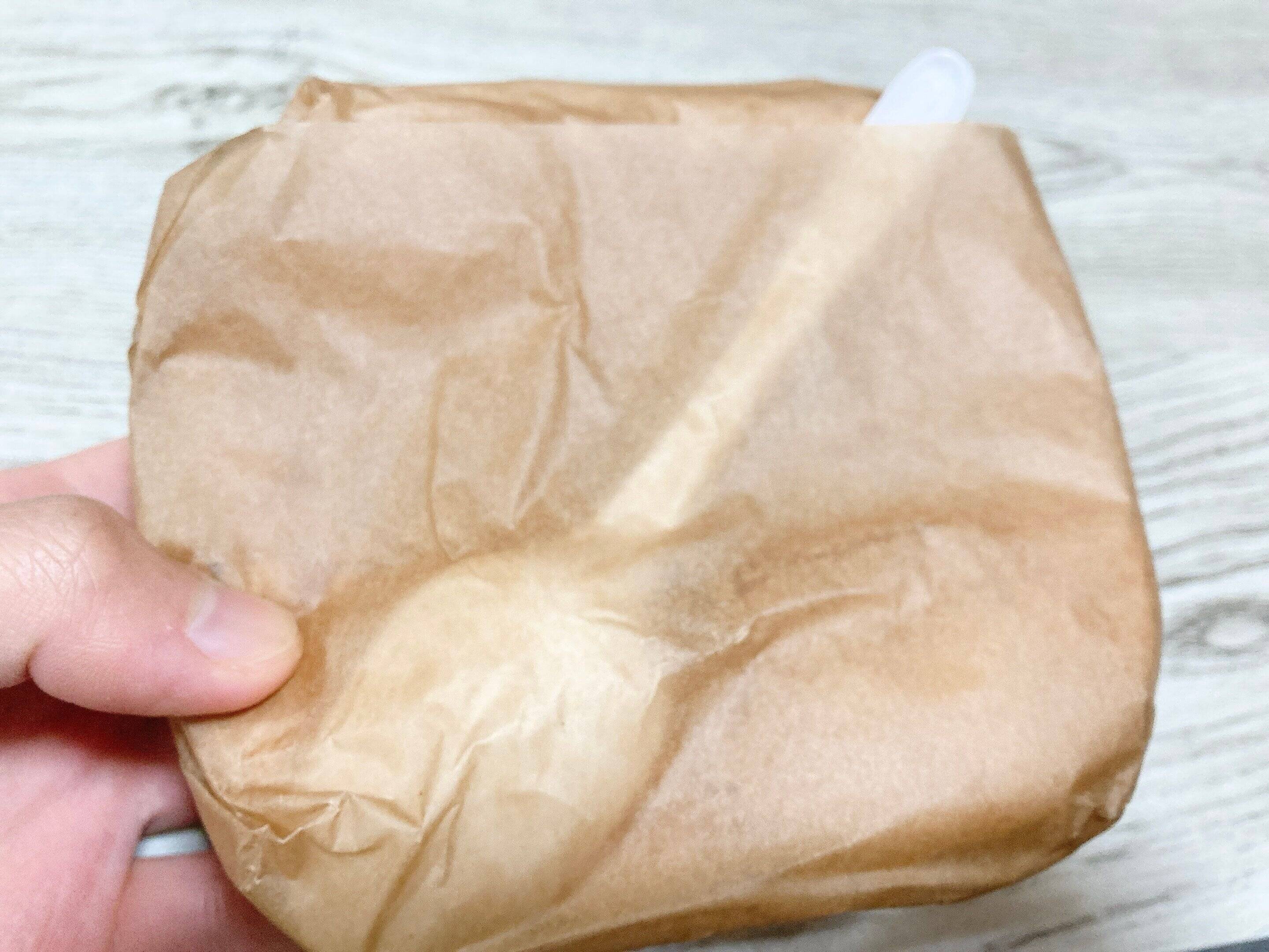 レジで注文すると、茶色の紙に包まれたパイとスプーンが渡されます。この際、結構熱いのと紙がツルツルしていて滑りやすく、落としやすいのでお気をつけくださいね。