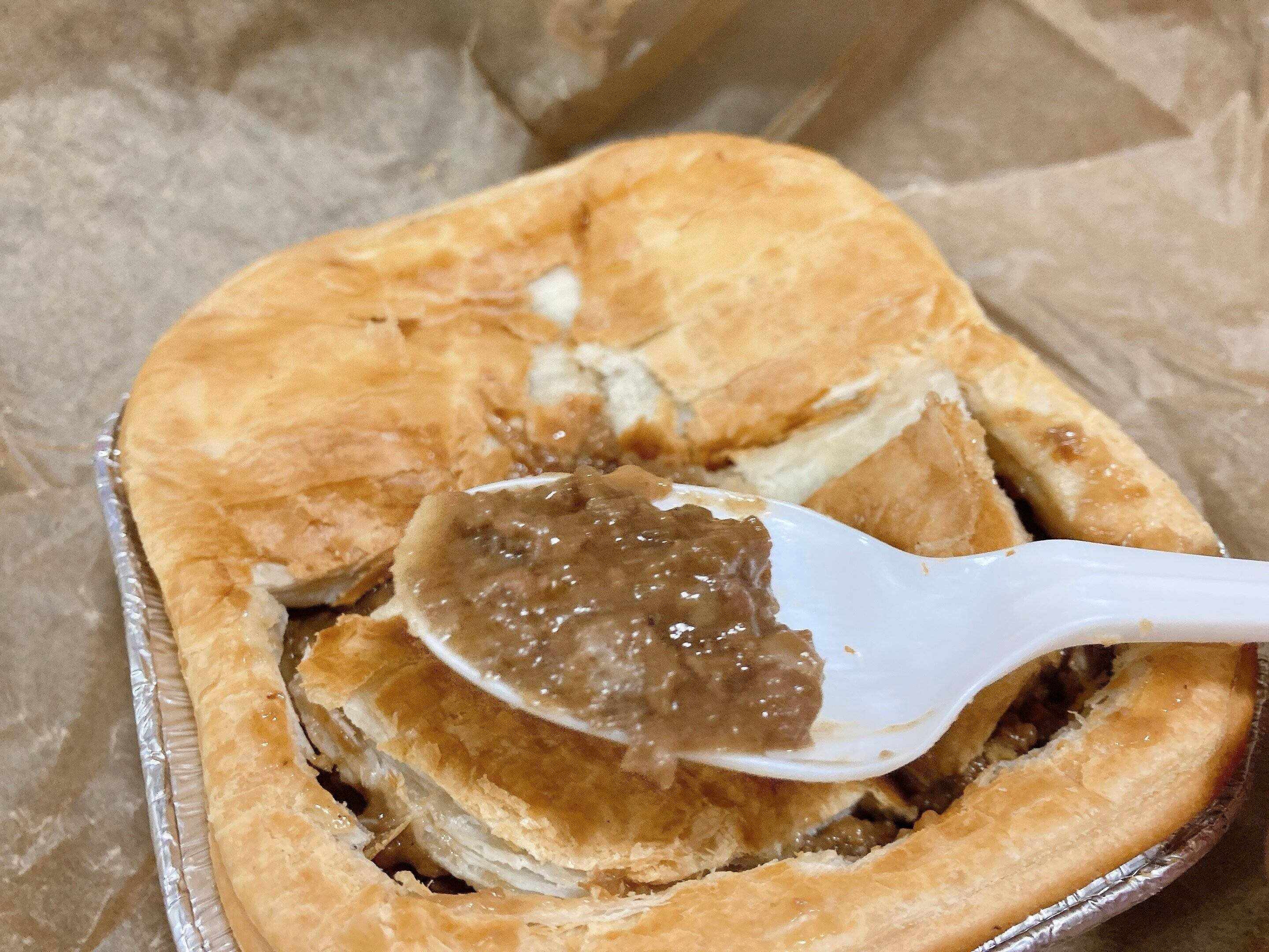 ソースはグレービーソースと説明がありましたが、デミグラスソースのような味わいで甘さはほぼなし。コショウと塩味がしっかり効いているので、パイと一緒に食べるとおいしかったです。