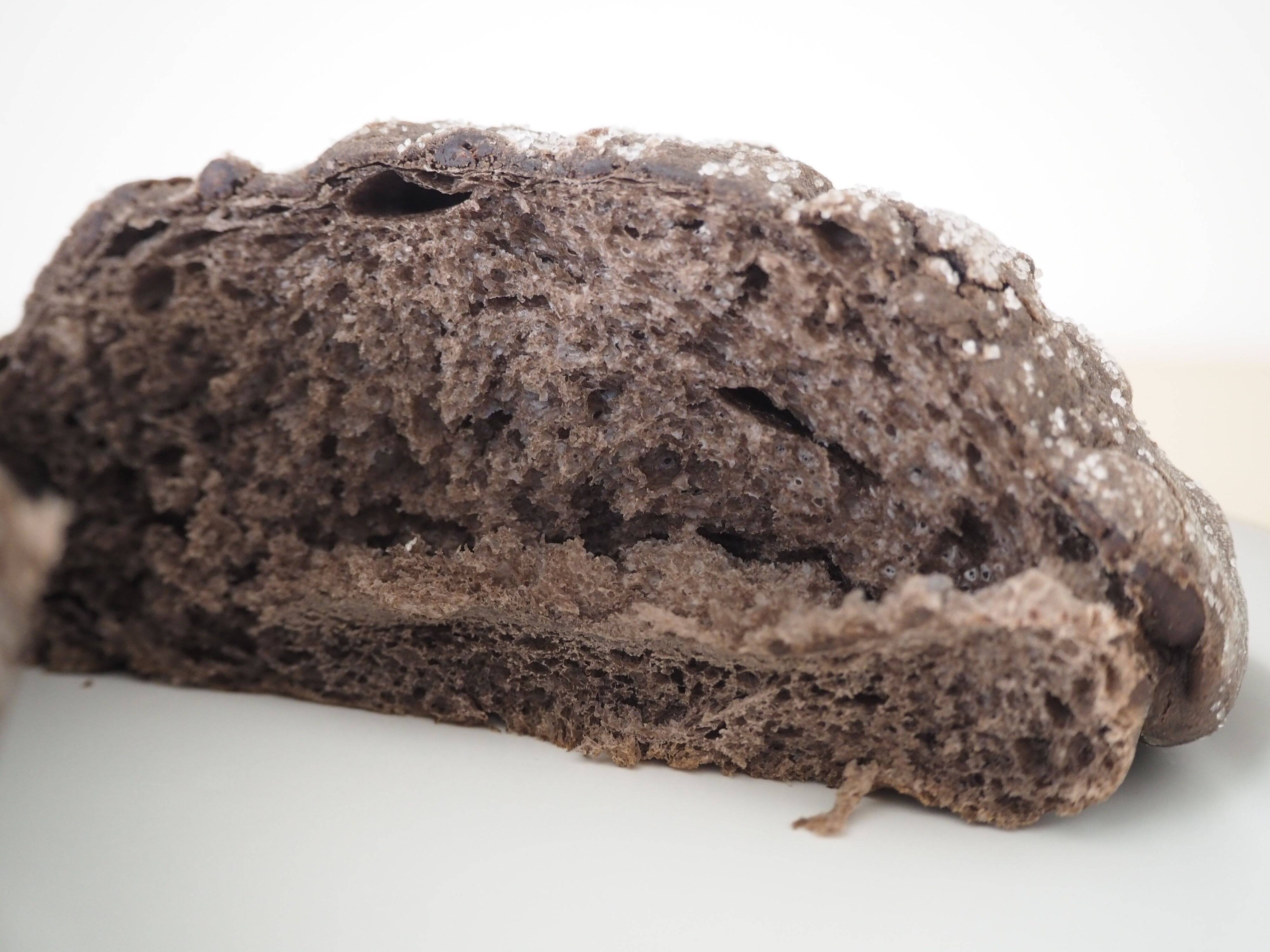 半分に切ってみたところ、中もしっかり黒です!想像以上にココアが香り、程よくしっとりしているのもいいですね。