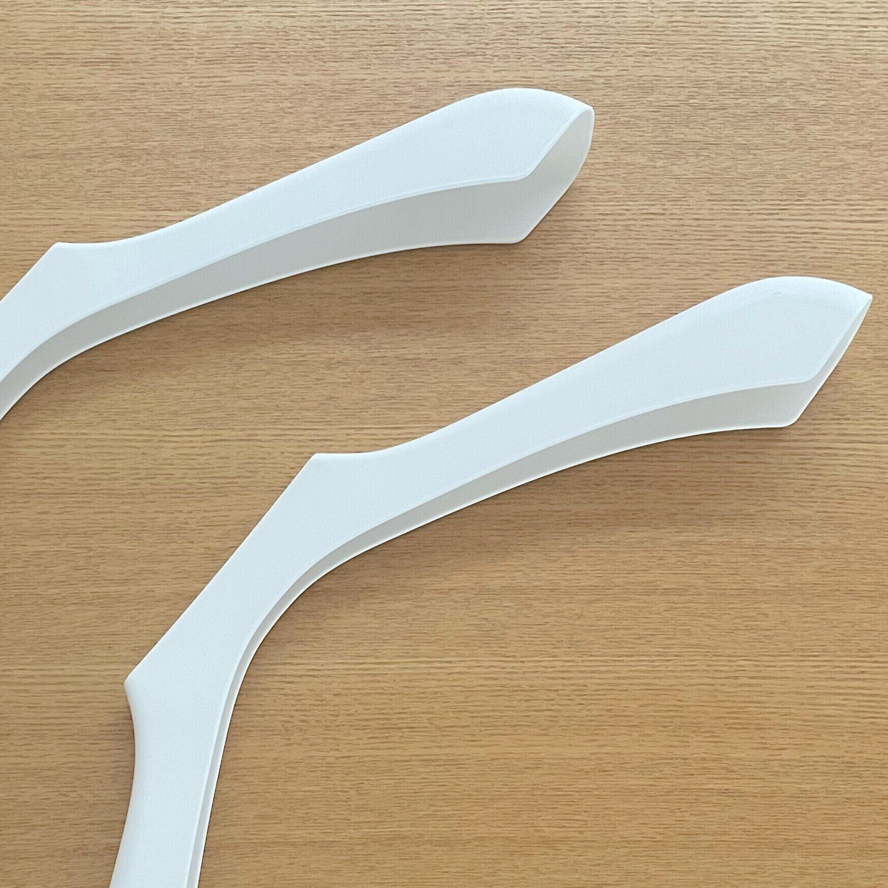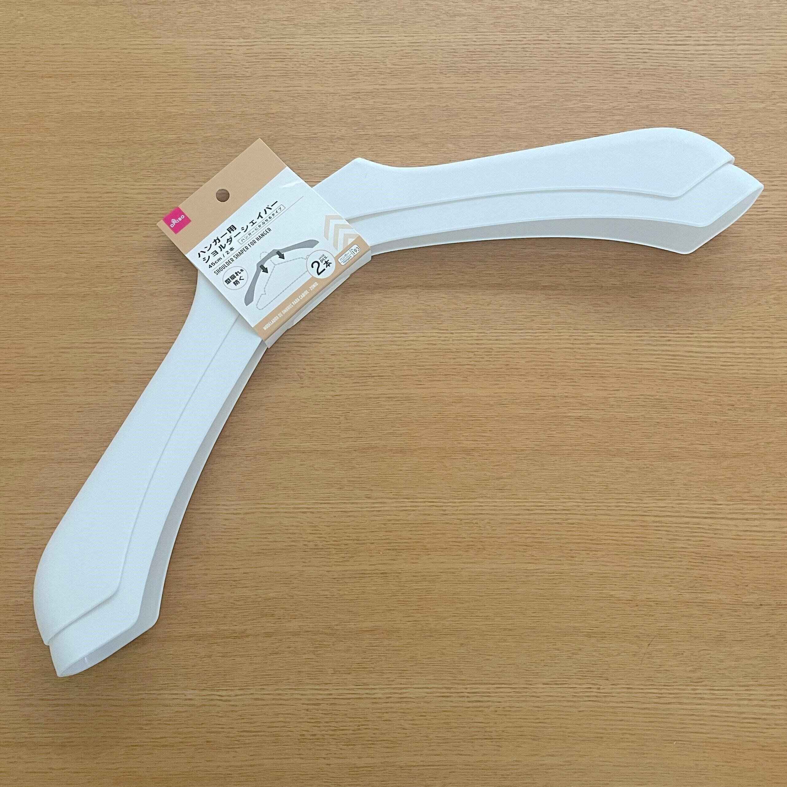 元のハンガーにショルダーシェイパーを合わせたものに洋服をかけると、このように肩部分のハンガー跡がつかなくなり見た目もキレイになりますよ!
