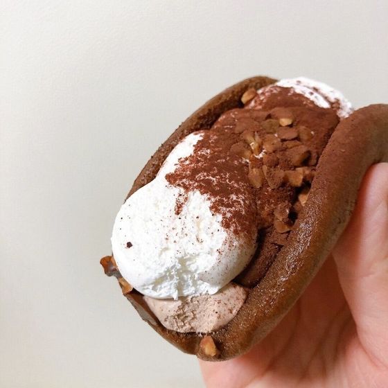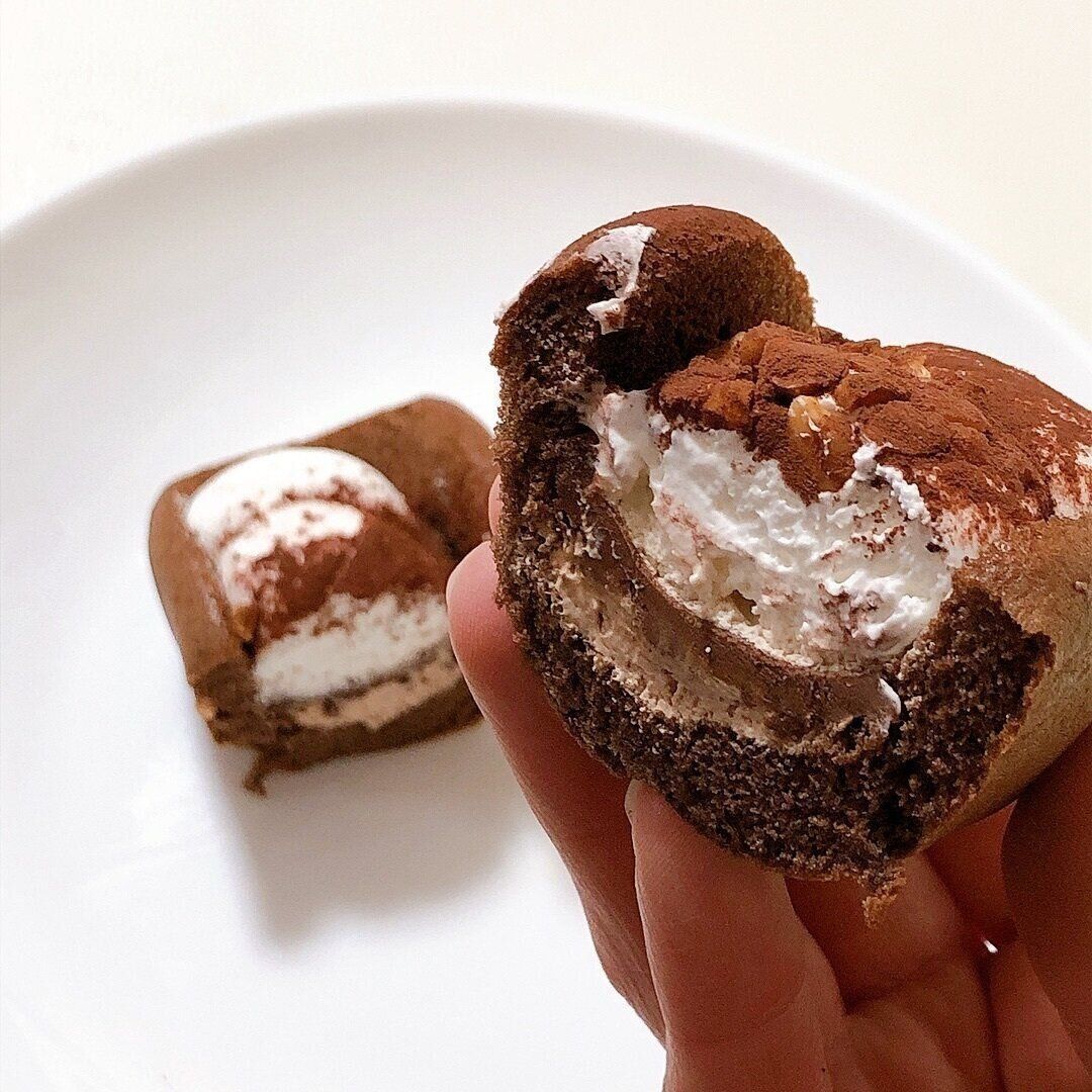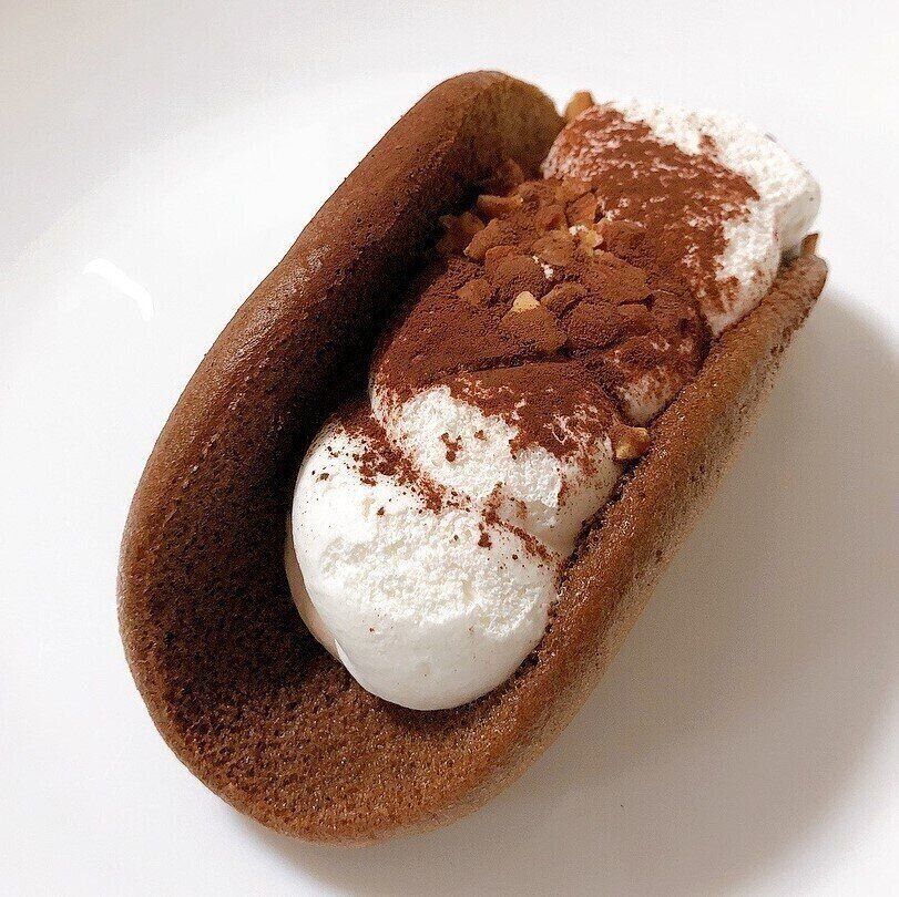 ふわふわのオムレット生地に、ホイップクリームとチョコクリームのダブルクリームが挟まれています。
