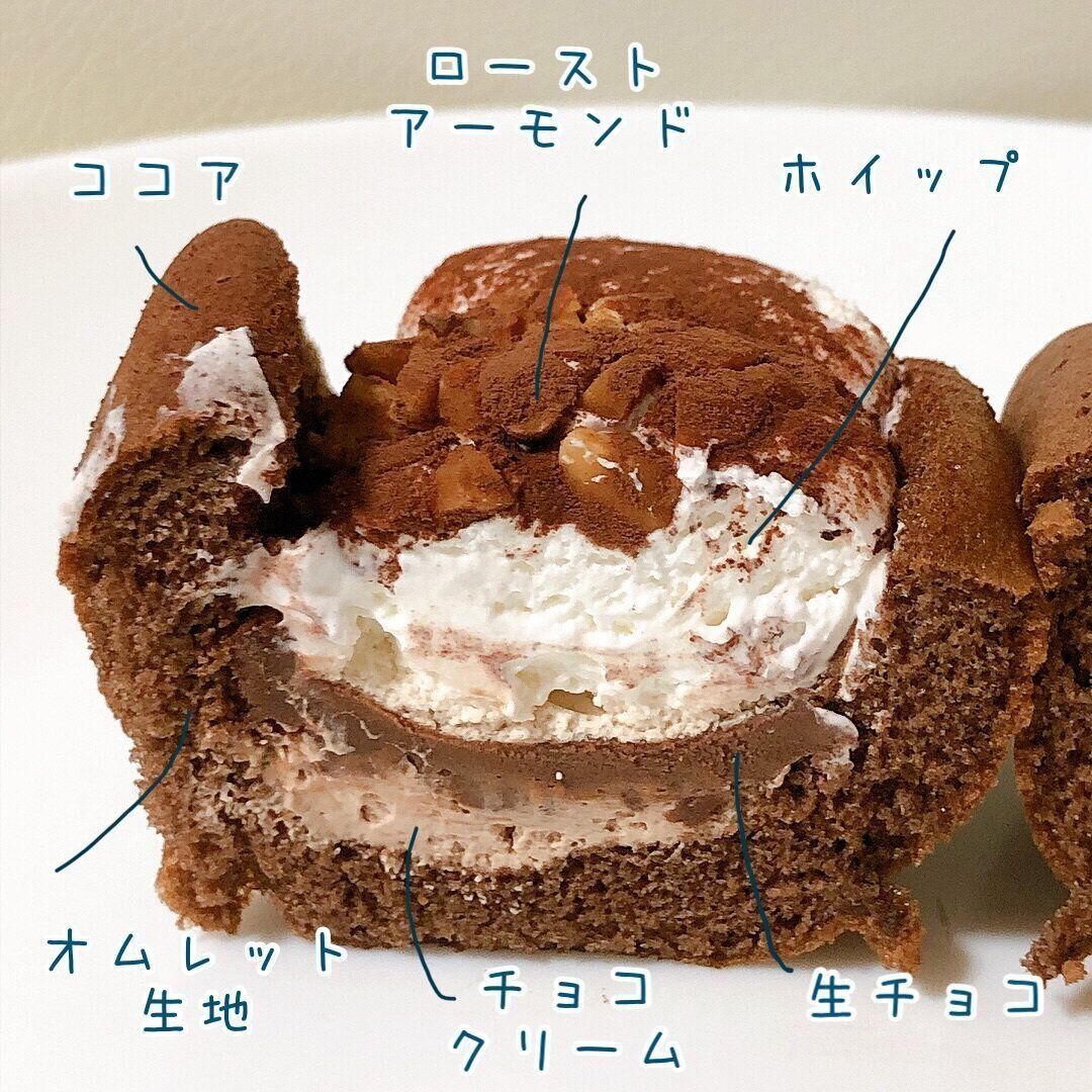 クリームの中には、こっそり生チョコが隠れています。トッピングにはローストしたアーモンドがちりばめられ、その上をココアパウダーが覆っています。