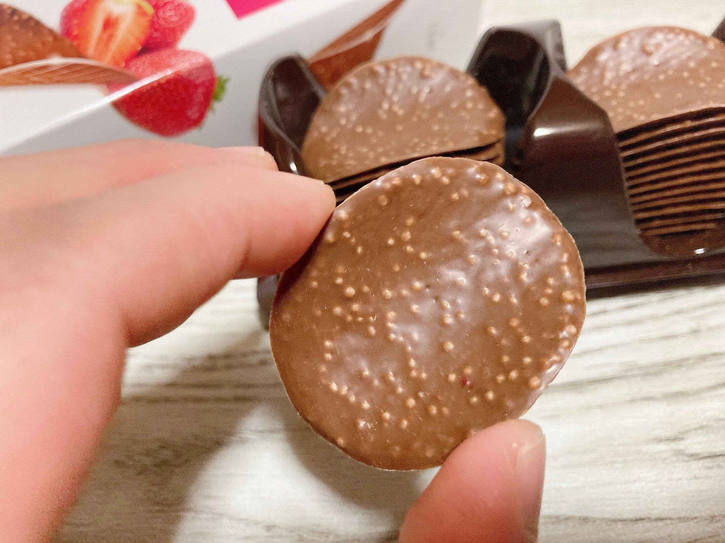 薄いチップス状のチョコにサクサクのライスパフがたっぷり!ストロベリー味は、香りが良く甘酸っぱくて甘いチョコだけどしつこくなく食べられておいしい!