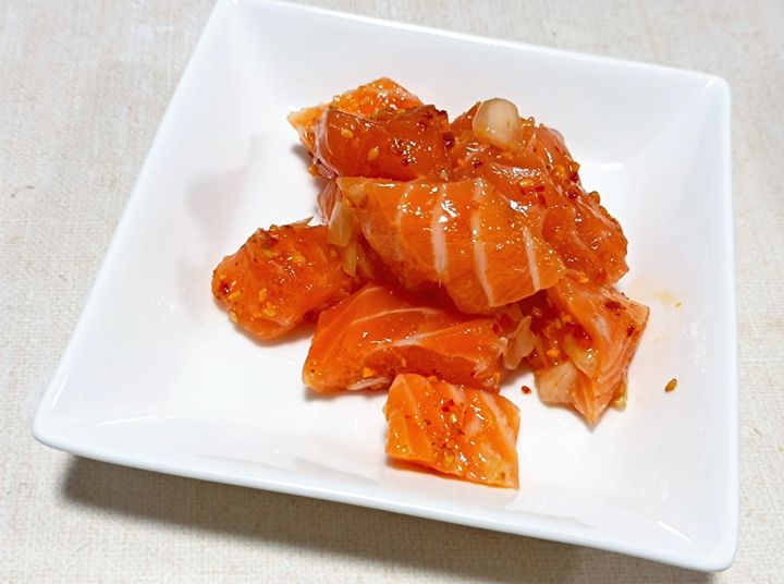 生のサーモンが一口サイズでゴロゴロと、そして玉ねぎのみじん切りもたっぷりはいっています。そしてごま油とピリっとする唐辛子が効いています。