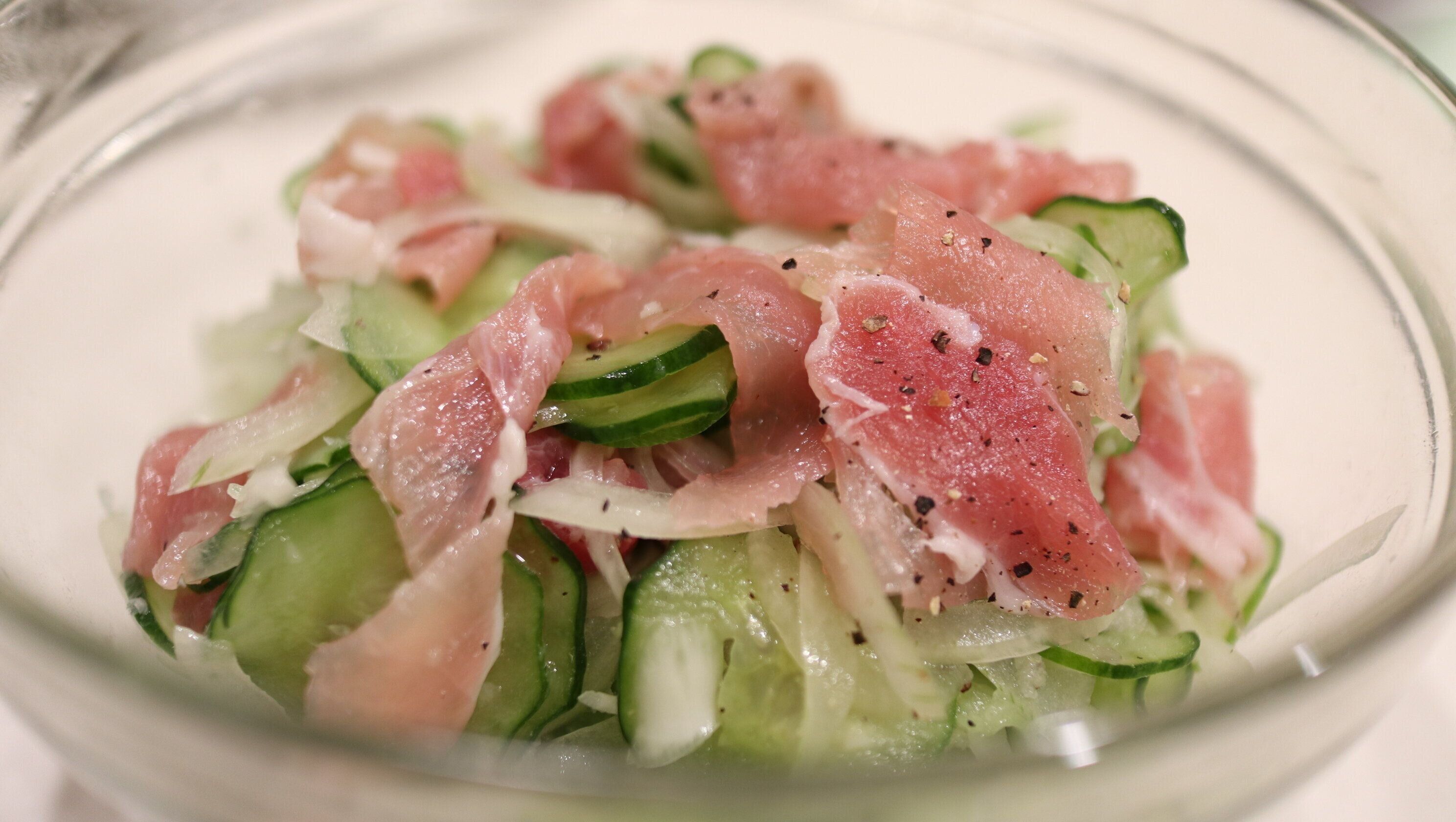 1.キュウリ・生ハムは太めの千切りにして和え、器に盛り付ける。