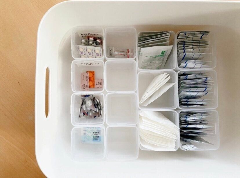 もう1箇所使っているのがお薬収納ボックスの中。細かな薬が上から見て一目瞭然に!幅に合わせてカップのサイズと個数を調整できるので手持ちのボックスに合わせてカスタマイズできます。見た目が整然とするのもお気に入りのポイントです。