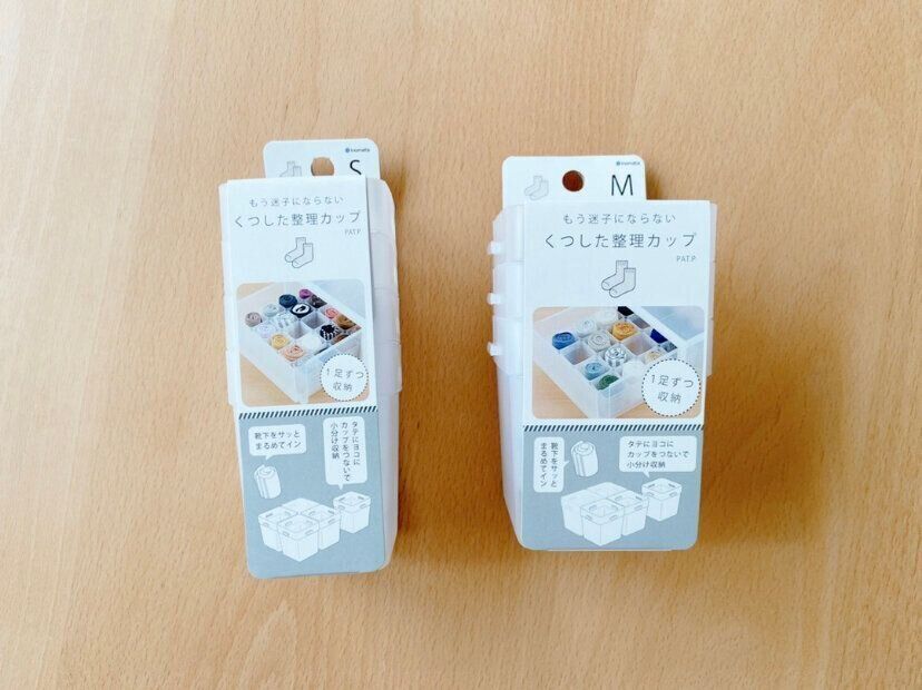 その名の通り、積み重ねてクチャクチャになりやすい靴下を整理するのに使えるアイテムです。Sカップは薄手の靴下向きで、冬の厚手の靴下を収納することを考えるとMサイズの方が余裕があって出し入れがしやすいです。
