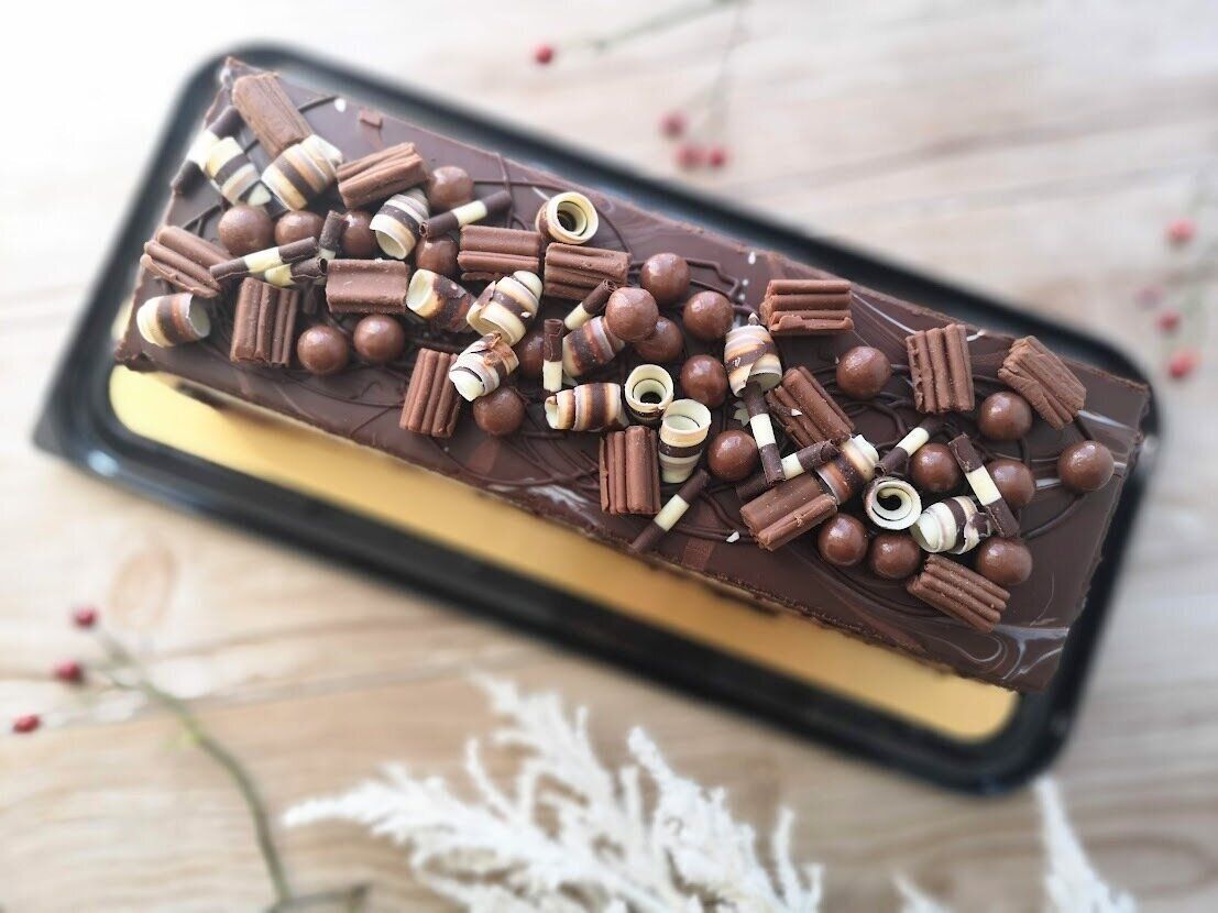 その上に、チョコレートコポーで作られた飾りチョコと、チョコボールが載せられていて、どこまでもチョコ満載のケーキに仕上がっています。