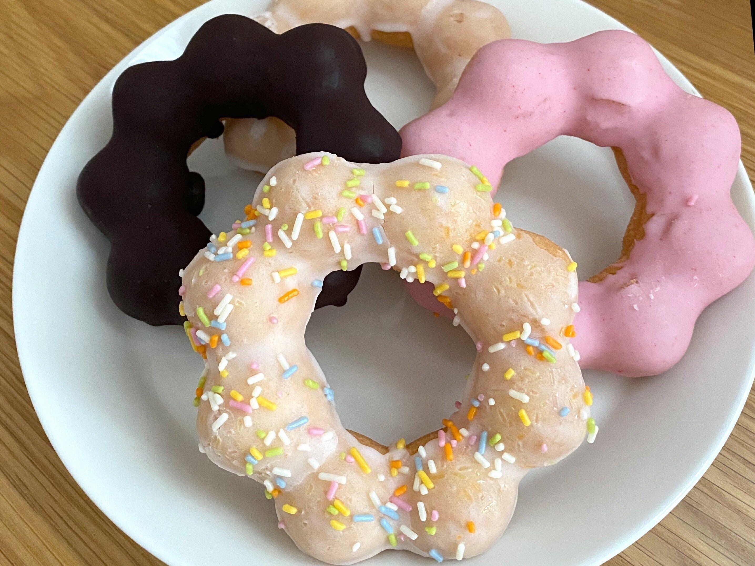 もちもち食感の生地をシュガー、チョコレート、いちごチョコレート、カラフルチョコでコーティングしたドーナツです。