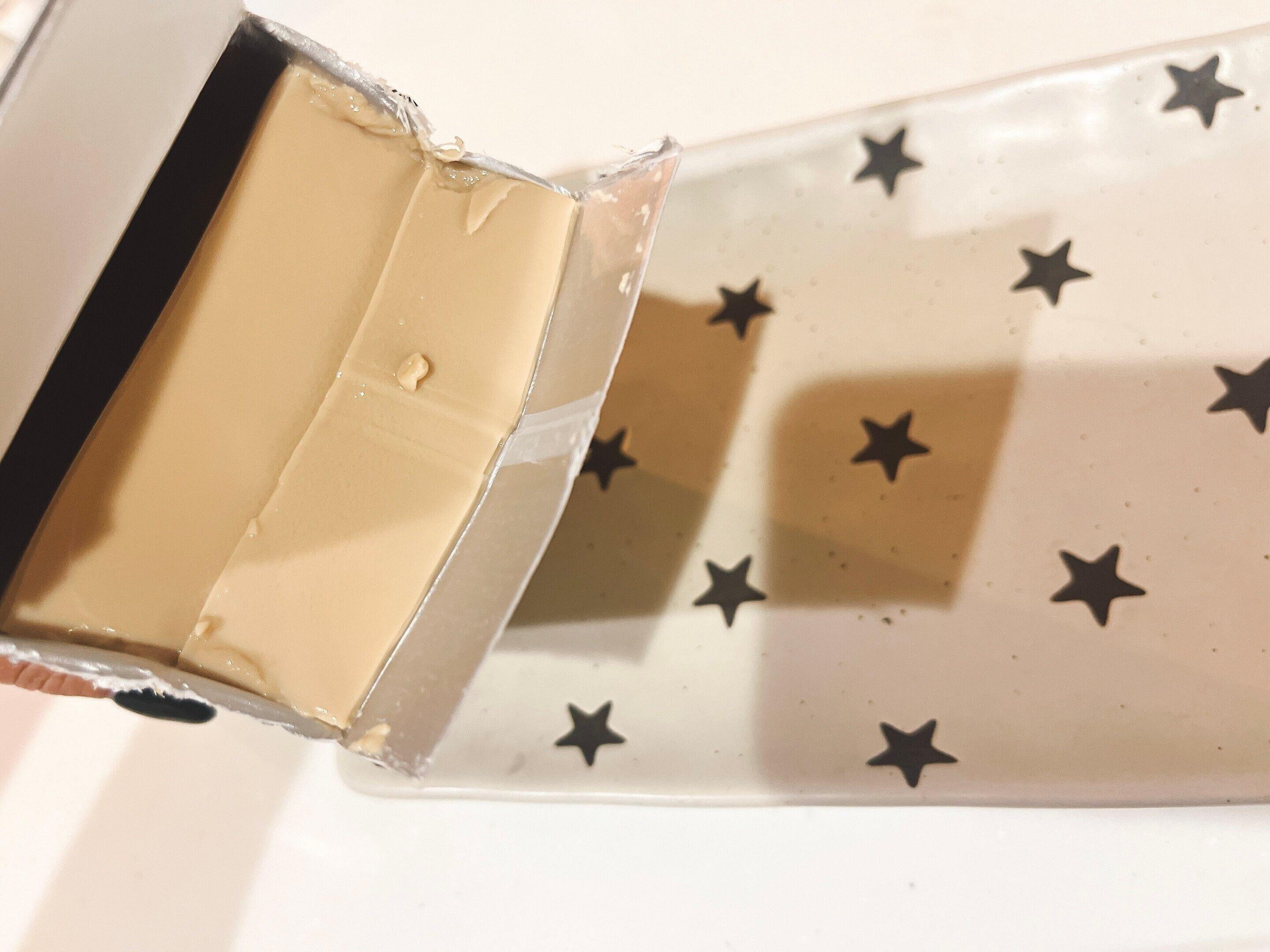 このままカットして食べてももちろん美味しいですが、子どもたちが喜ぶので、一度火にかけ溶かし、デザート用の器に流し込みました。