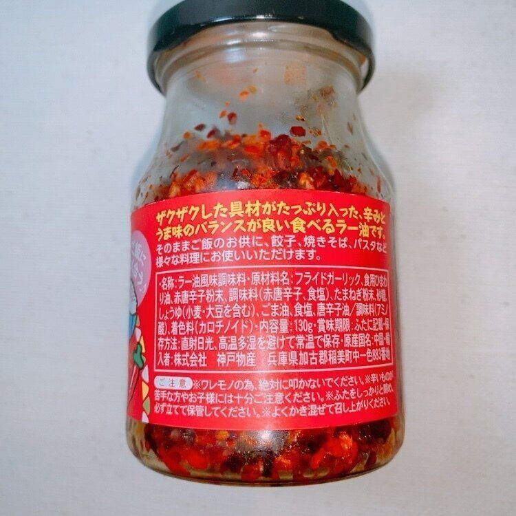 原材料名:フライドガーリック、食用ひまわり油、赤唐辛子粉末、調味料(赤唐辛子、食塩)、たまねぎ粉末、砂糖、しょうゆ(小麦・大豆を含む)、ごま油、食塩、唐辛子油/調味料(アミノ酸)、着色料(カロチノイド)