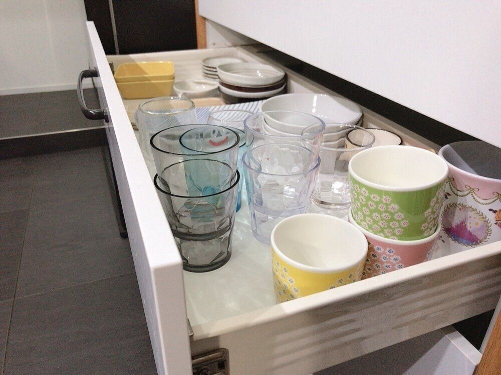 コップは食器棚の上段に置いていると言うご家庭も多いかもしれませんが、我が家には食器棚がないためカップボードの引き出しにしまってあります。
