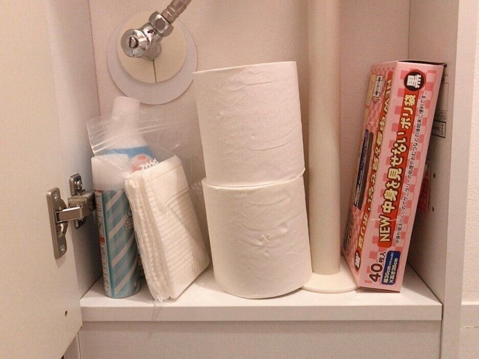 これもなんとかならないものかと考えて、手洗い器の小さな収納に予備のトイレットペーパーを2つ置くようにしました。