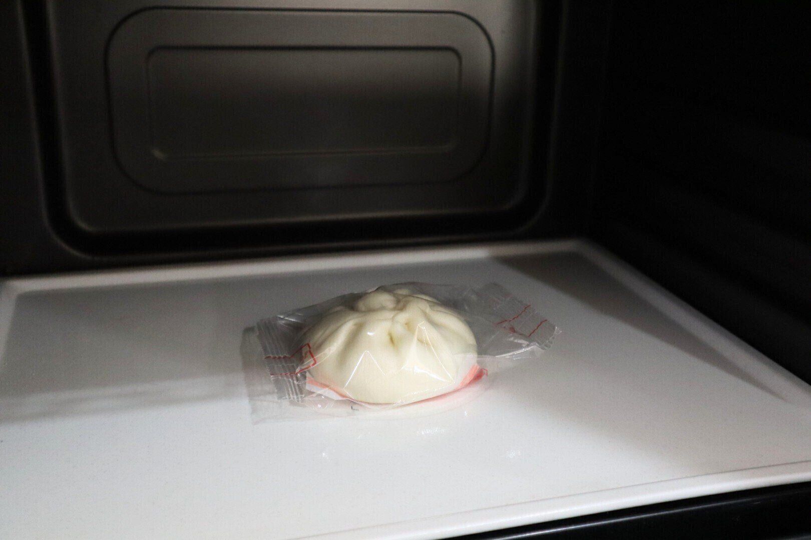 この肉まんは、包装が容器とラップの代わりをしてくれるので、すぐに電子レンジに入れることができ、忙しい朝にもぴったりです。
