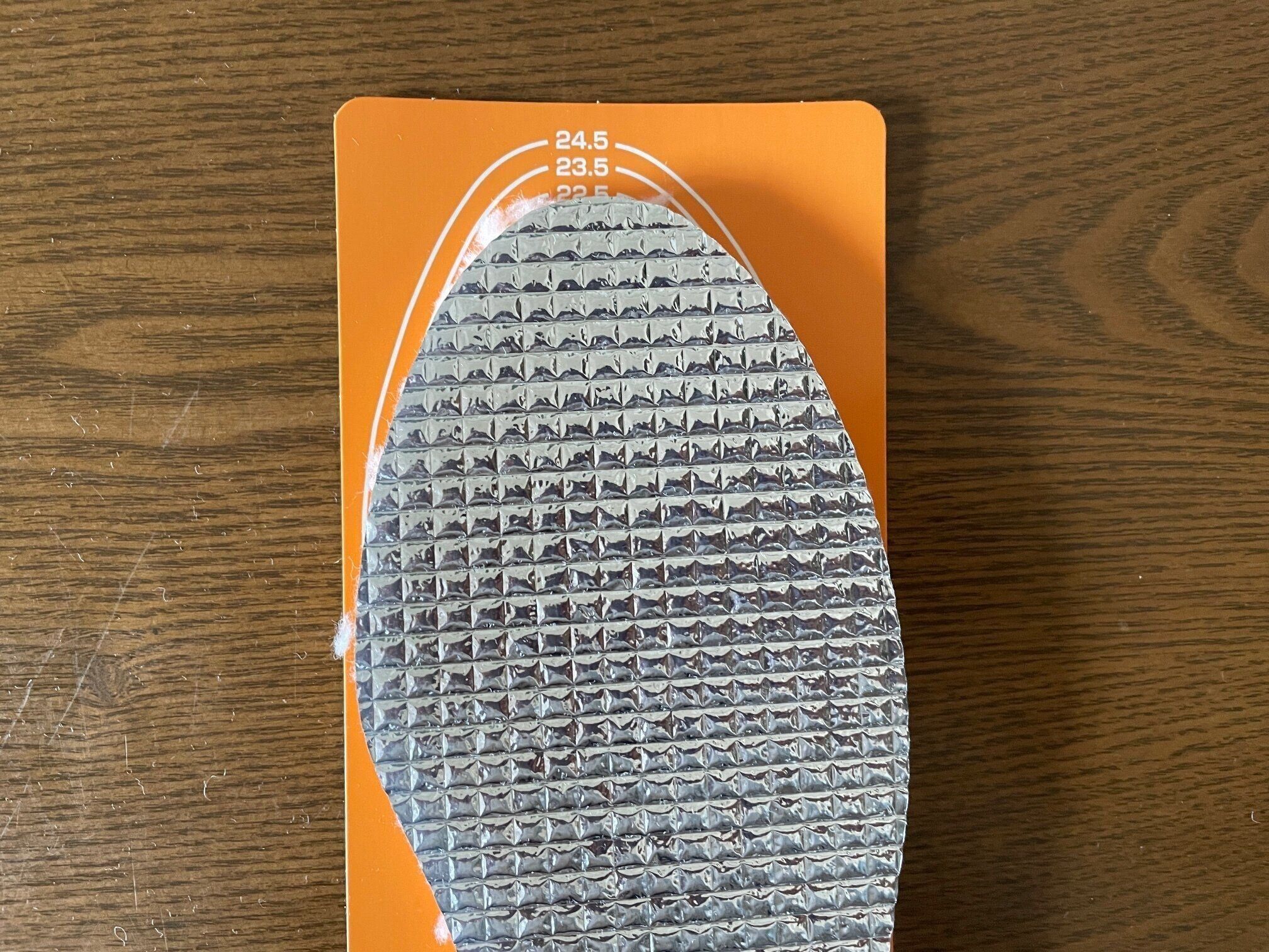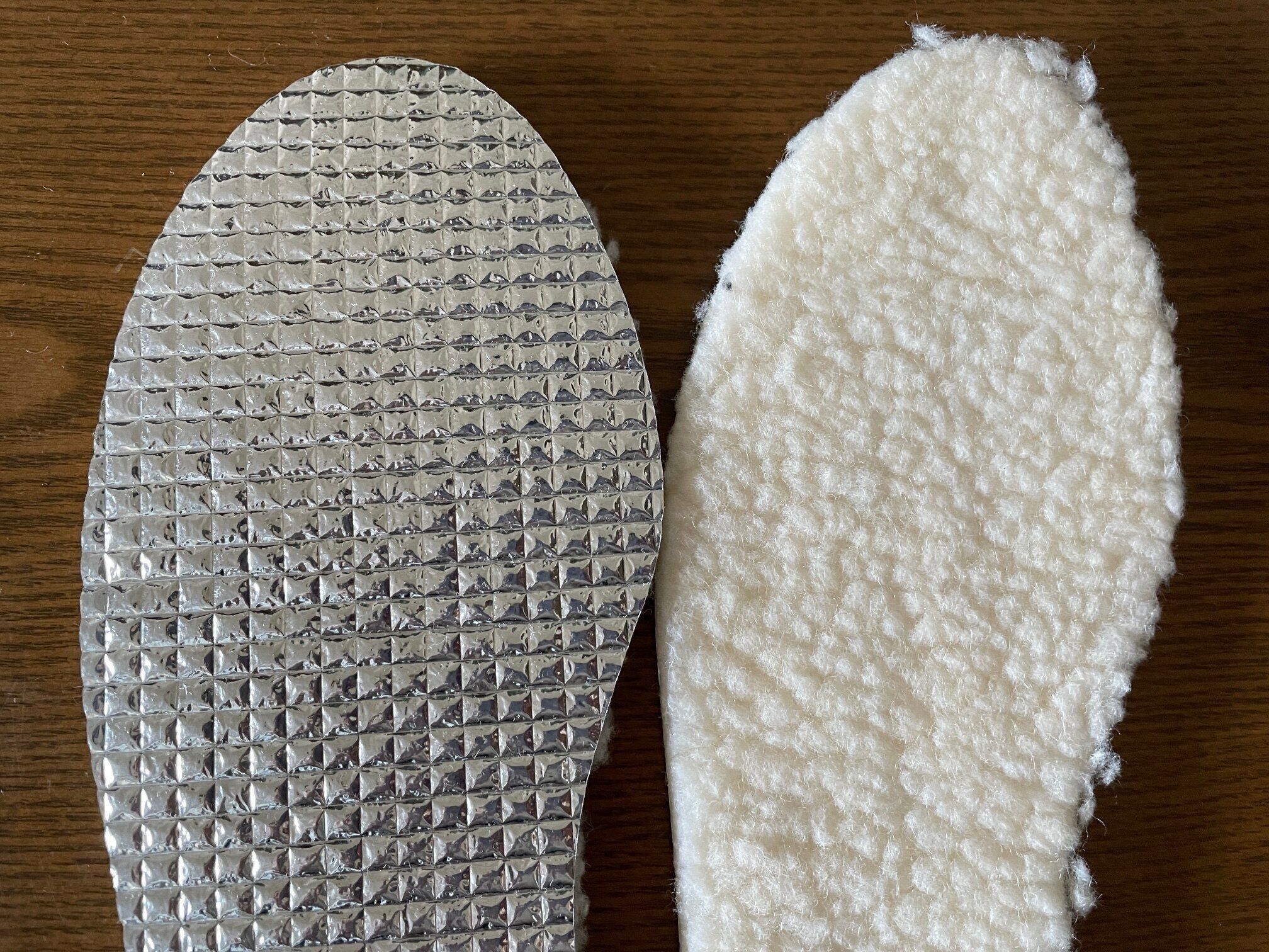 実はこの中敷き、二層になっていて、表がボア、裏がアルミになっているんです。