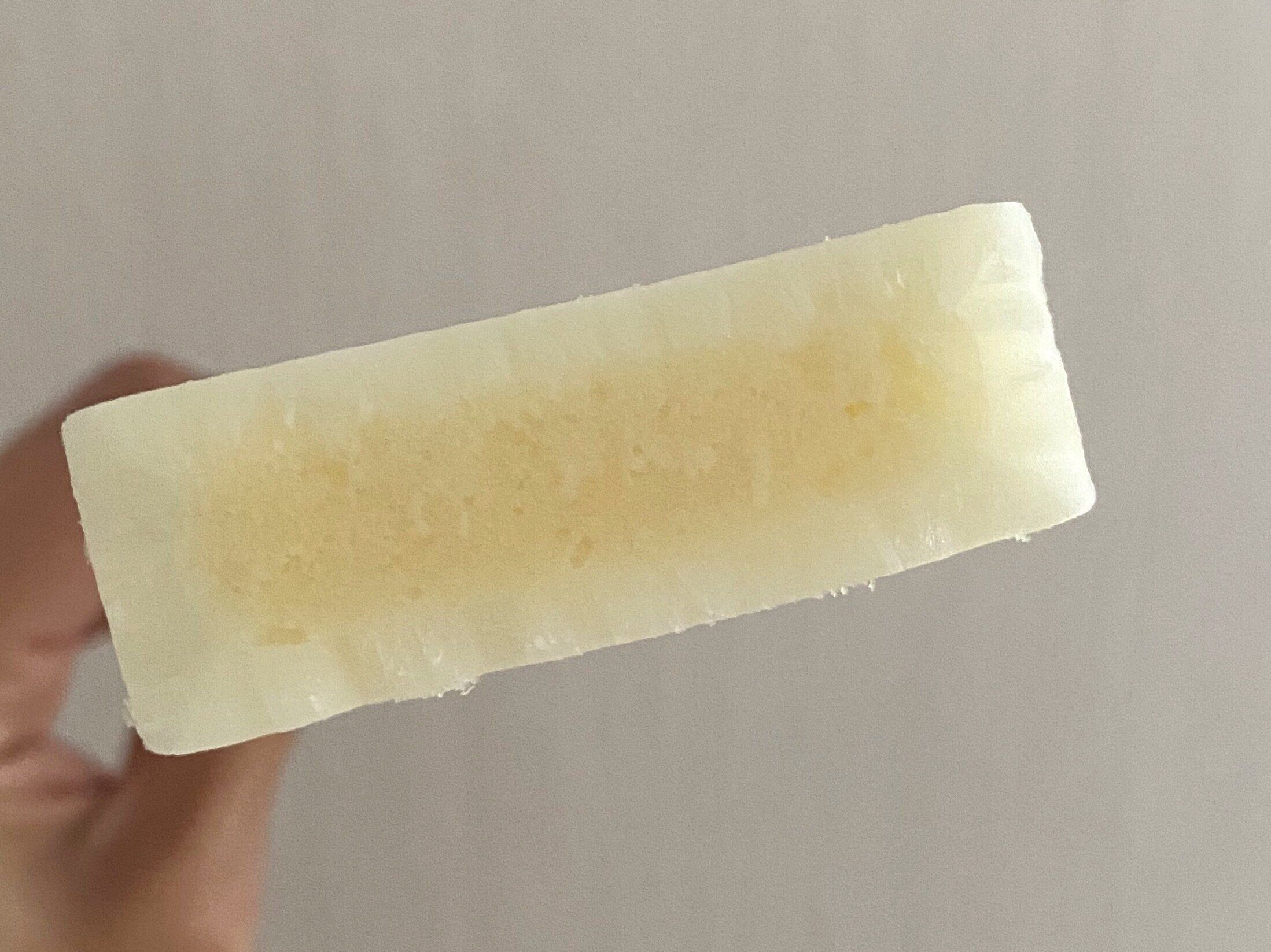 実はこのアイス、二層構造になっていまして、外側はまるでリンゴのようなシャリシャリとした食感でサッパリした味わい。中は口あたりの良いシャーベットで濃厚なリンゴの味と絶妙な甘酸っぱさを楽しめます。