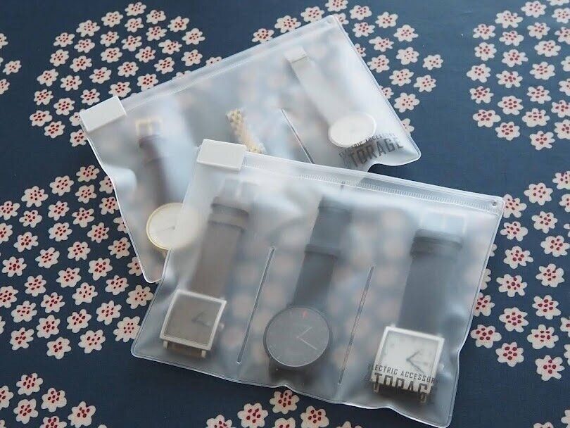 ポーチに仕切りが入っているので、小物類を3つに分けて収納できるようになっています。我が家では腕時計収納に使っています。
