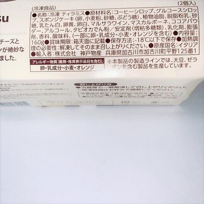 原材料名:コーヒーシロップ、グルコースシロップ、スポンジケーキ(卵、小麦粉、砂糖、ぶどう糖)、植物油脂、脱脂粉乳、砂糖、乳たん白、卵黄、卵白、マルサラワイン、マスカルポーネ、ココアパウダー、アルコール、タピオカでん粉/安定剤(増粘多糖類)、乳化剤、膨張剤、香料、酸味料、(一部に卵・乳成分・小麦・オレンジを含む)