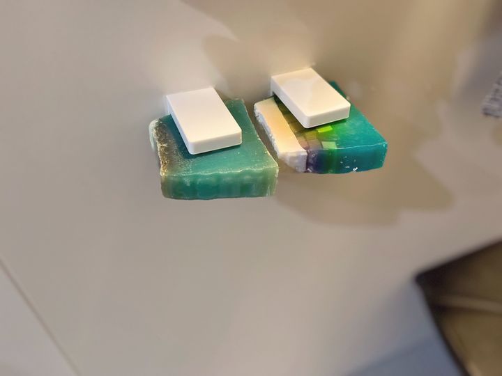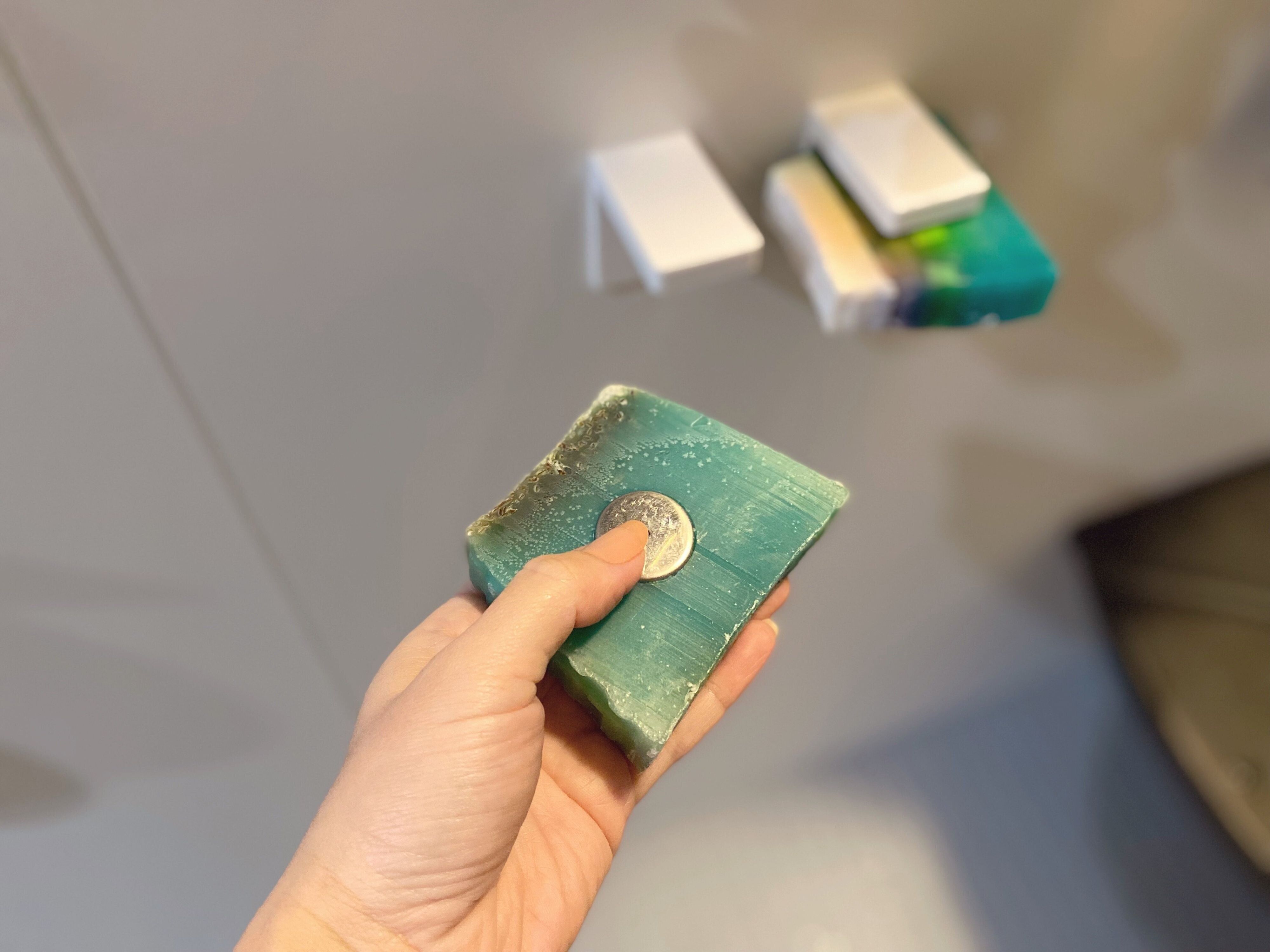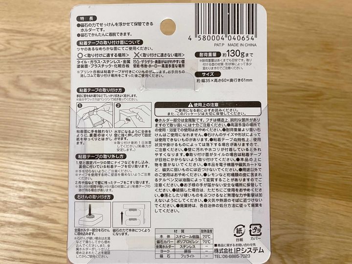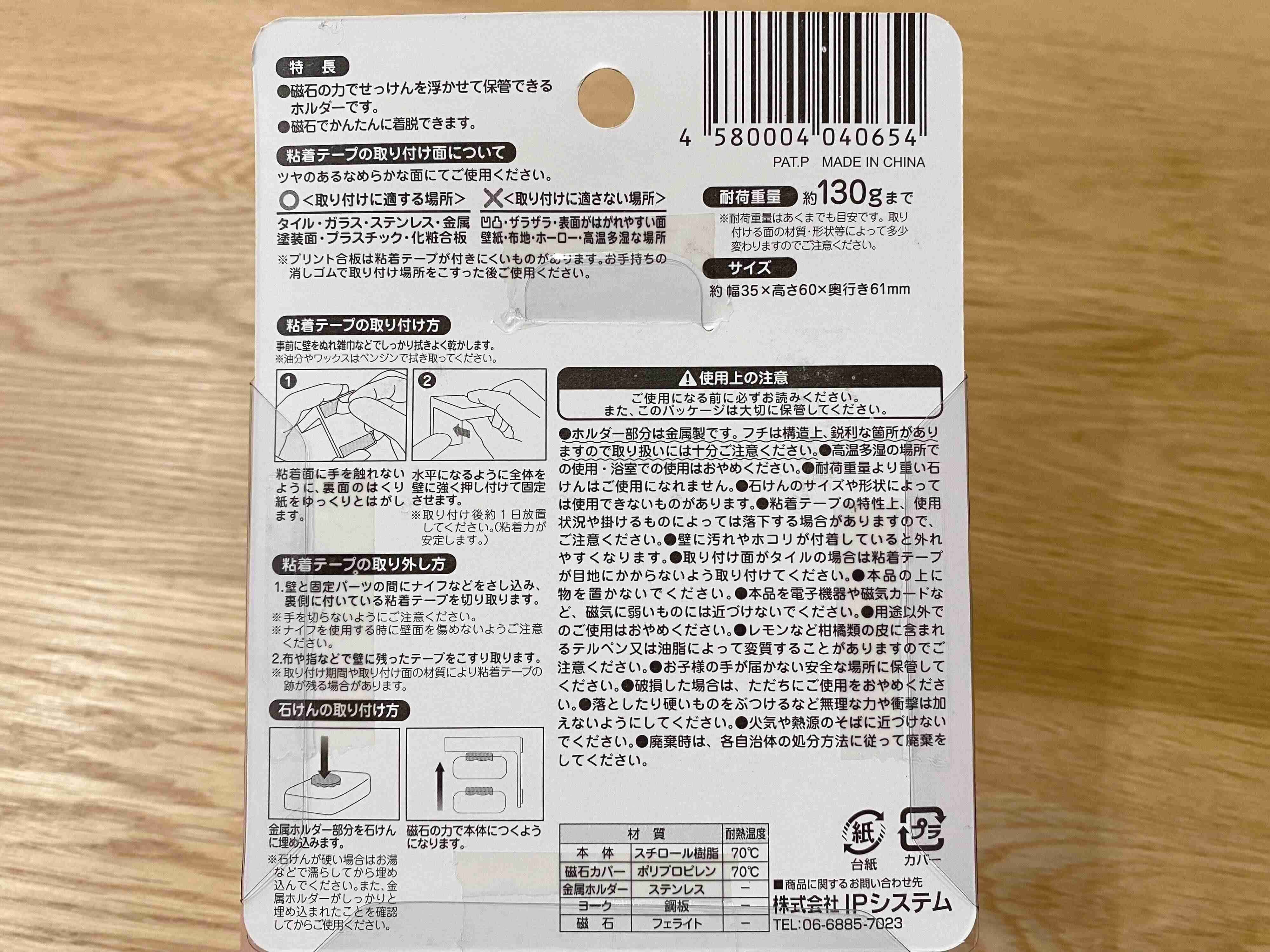 トレーに石けんを入れて保管していると水が溜まってしまい、石けんが溶けてヌルヌルしてしまいます。その点、石けんホルダーはマグネットで石けんを吊り下げているので、よく乾いてヌルヌルになりにくいのです。