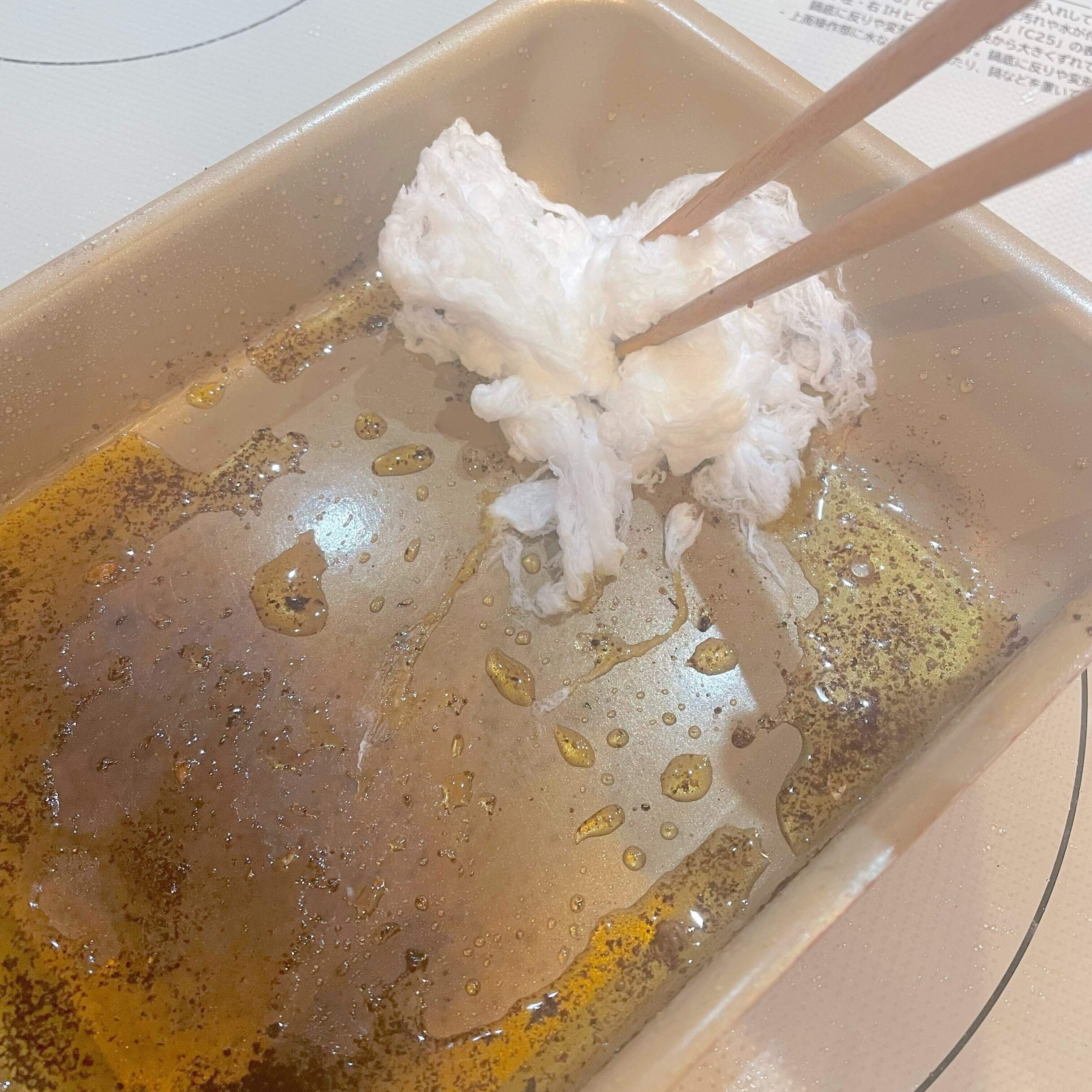 ちぎったわたぐもをフライパンに入れ、お箸などを使って油を吸わせるようにします。