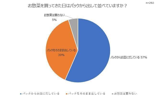 夕食のおかずにお惣菜を利用する人も多いことでしょう。その場合「お惣菜を買ってきた日はパックから出して並べていますか?」という質問に対しては、57%の人が「パックからお皿に出している」と答えました。