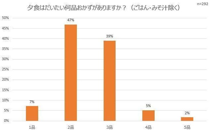 夕飯のおかずの品数は、ごはん・みそ汁以外に2品を用意する人が47%、3品が39%という回答結果に。