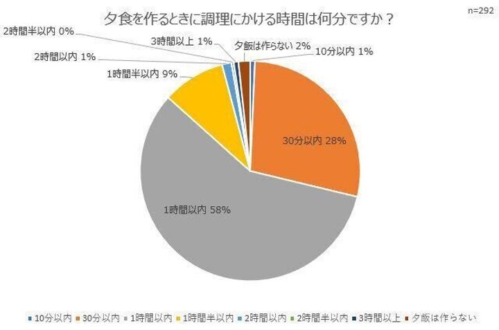 30分以内で終わる人も約3割と、うまく時短できている人も少なくなさそう。スーパーでも多く販売されいてる半調理済み食材やお料理セットを使ったり、電子レンジやホットクックなどを利用するなど、時短のための調理家電や商品が増えたこともその理由かもしれません。