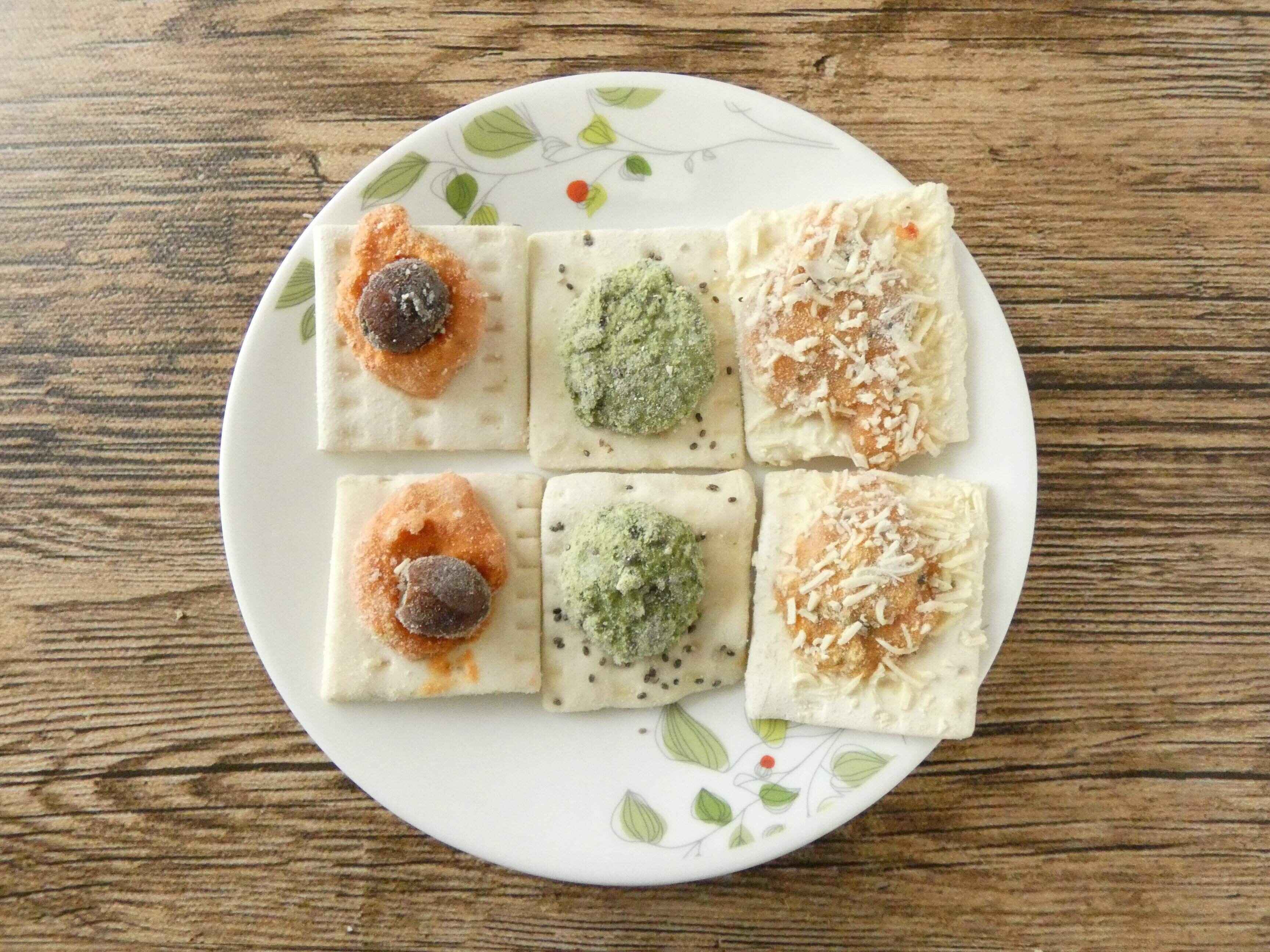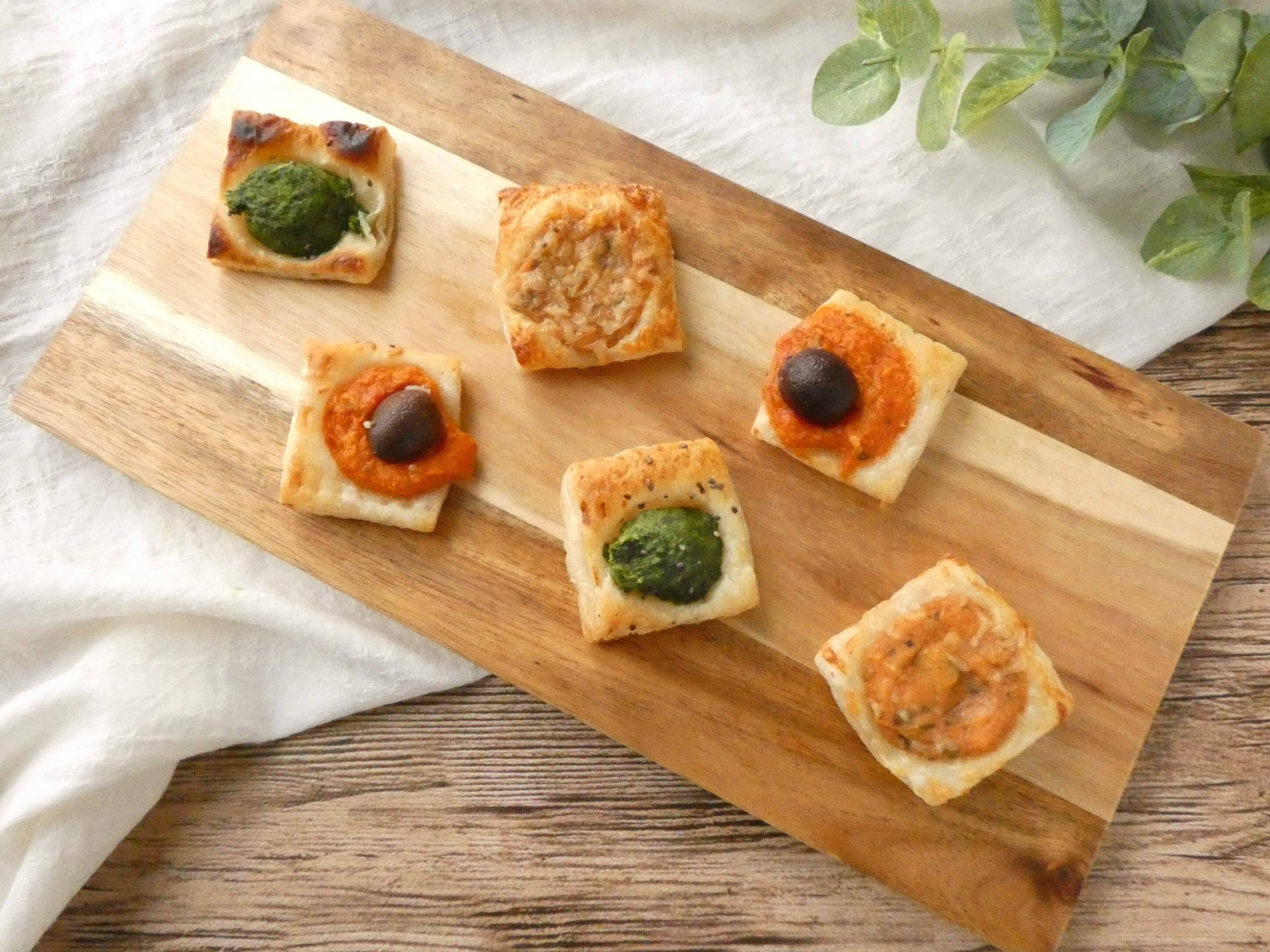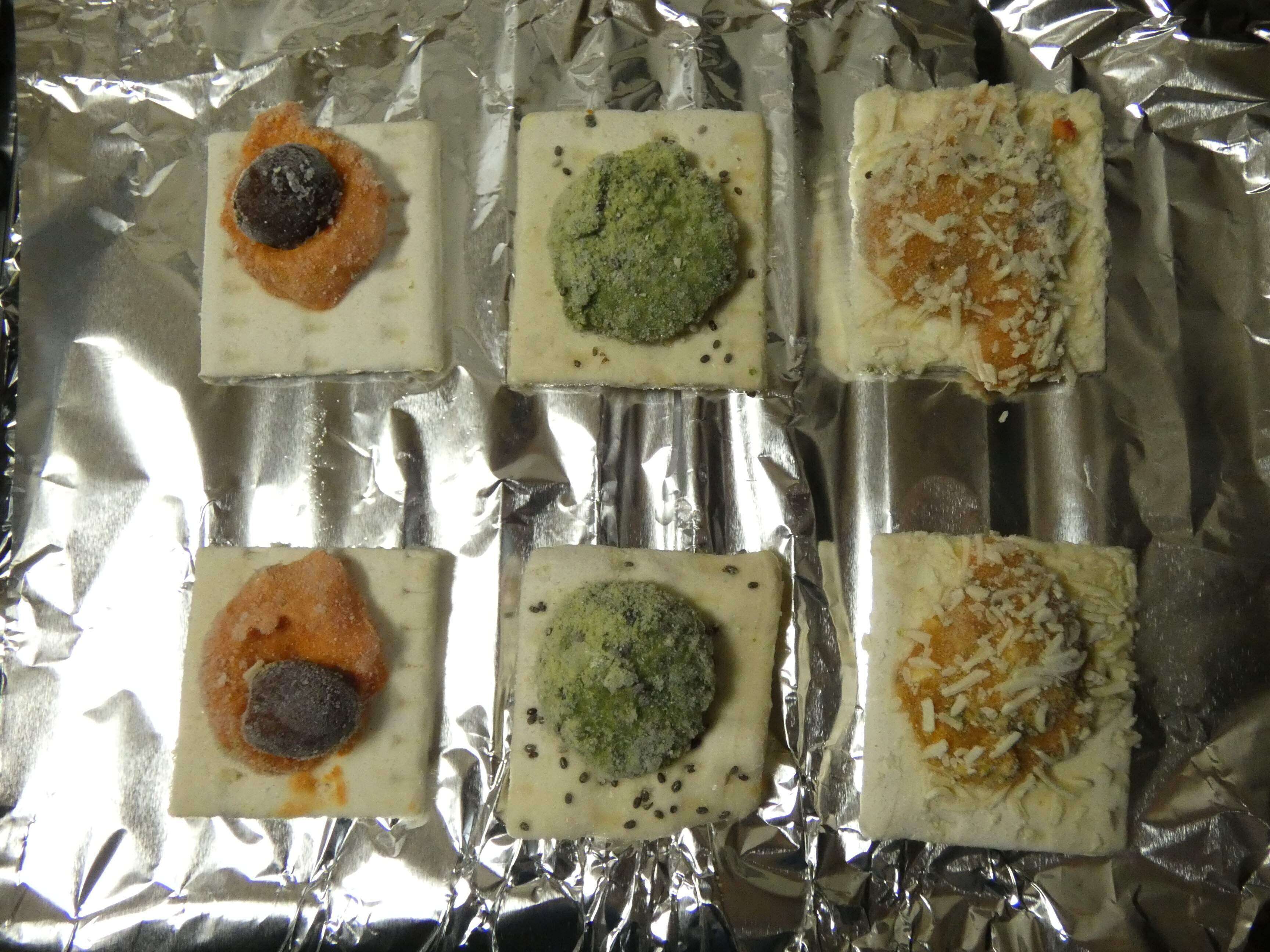 トマト&モッツァレラ、リコッタ&ほうれん草、パプリカ&ブラックオリーブの3種類のカナッペが各4個ずつ。それぞれの具がトッピングされて冷凍してあります。