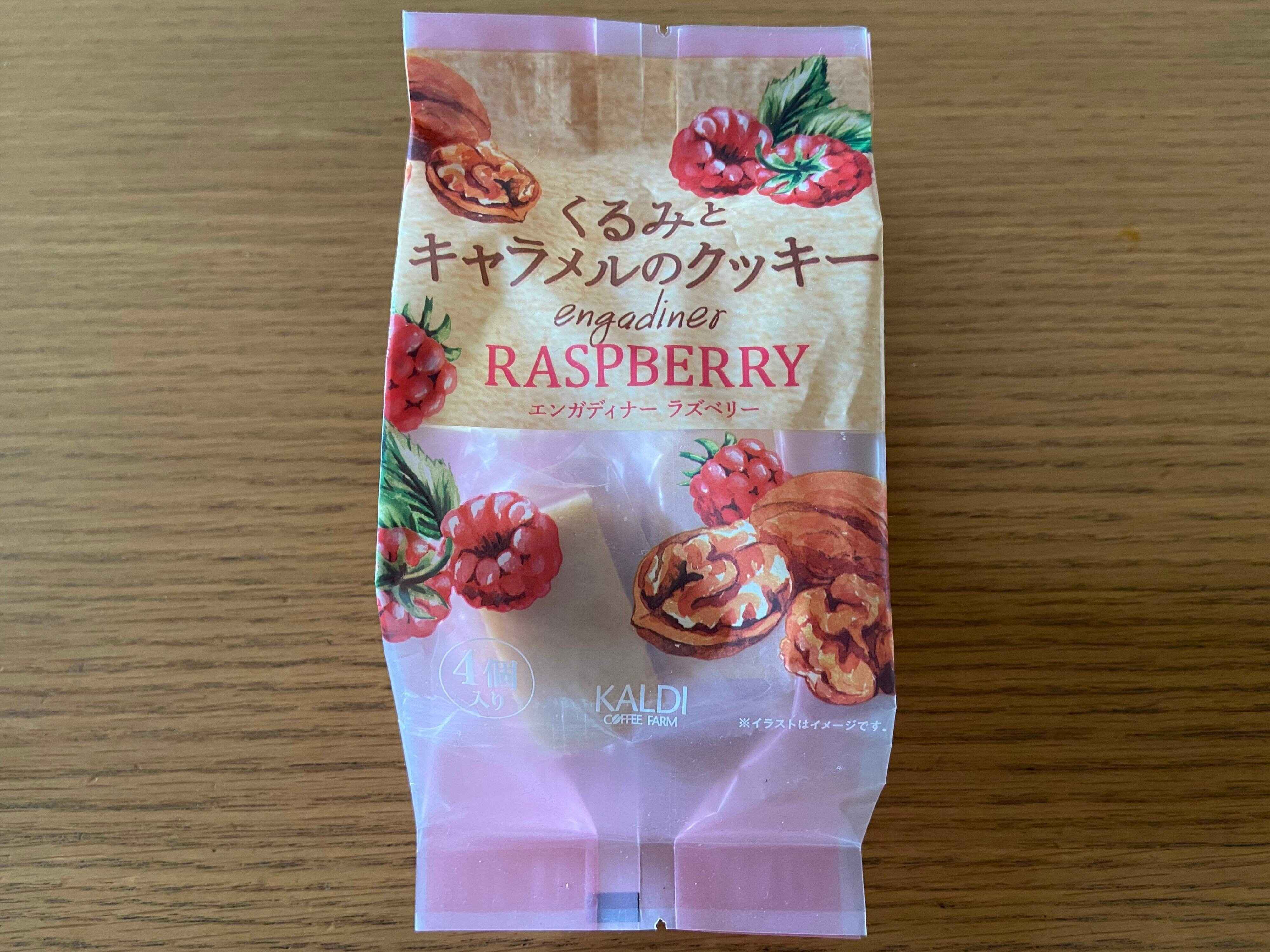 ラズベリーとくるみのイラストがとってもかわいらしいパッケージの、「くるみとキャラメルのクッキー(エンガディナーラズベリー)」(購入時:388円)。